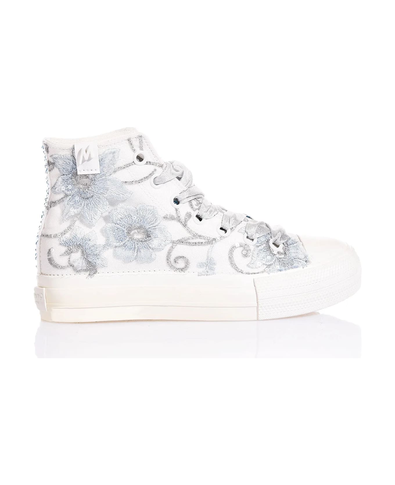 Mimanera Airlines Platform Blue Antonette: a tribute to the charm and lavish style of Marie Antoinette's court, for those who desire a regal and unmistakable look. Inspired by the classic Converse model, these platform sneakers with an entirely white sole offer a modern touch and elongate the figure, without compromising on comfort. The Mimanera Airlines Platform Blue Antonette is fully embroidered in shades of blue and silver with lurex threads and sequins on tulle, evoking the opulence and delicacy of the Versailles palace, adding a touch of sophistication and femininity. The white eyelets and silver laces delicately contrast with the trail of Swarovski crystals on the back, giving an additional touch of elegance and making these sneakers perfect for those who wish to relive the atmosphere of the French court with a modern twist. This model has a slightly generous fit, so if you wear a half size (e. g. , 36. 5), choose size 36.