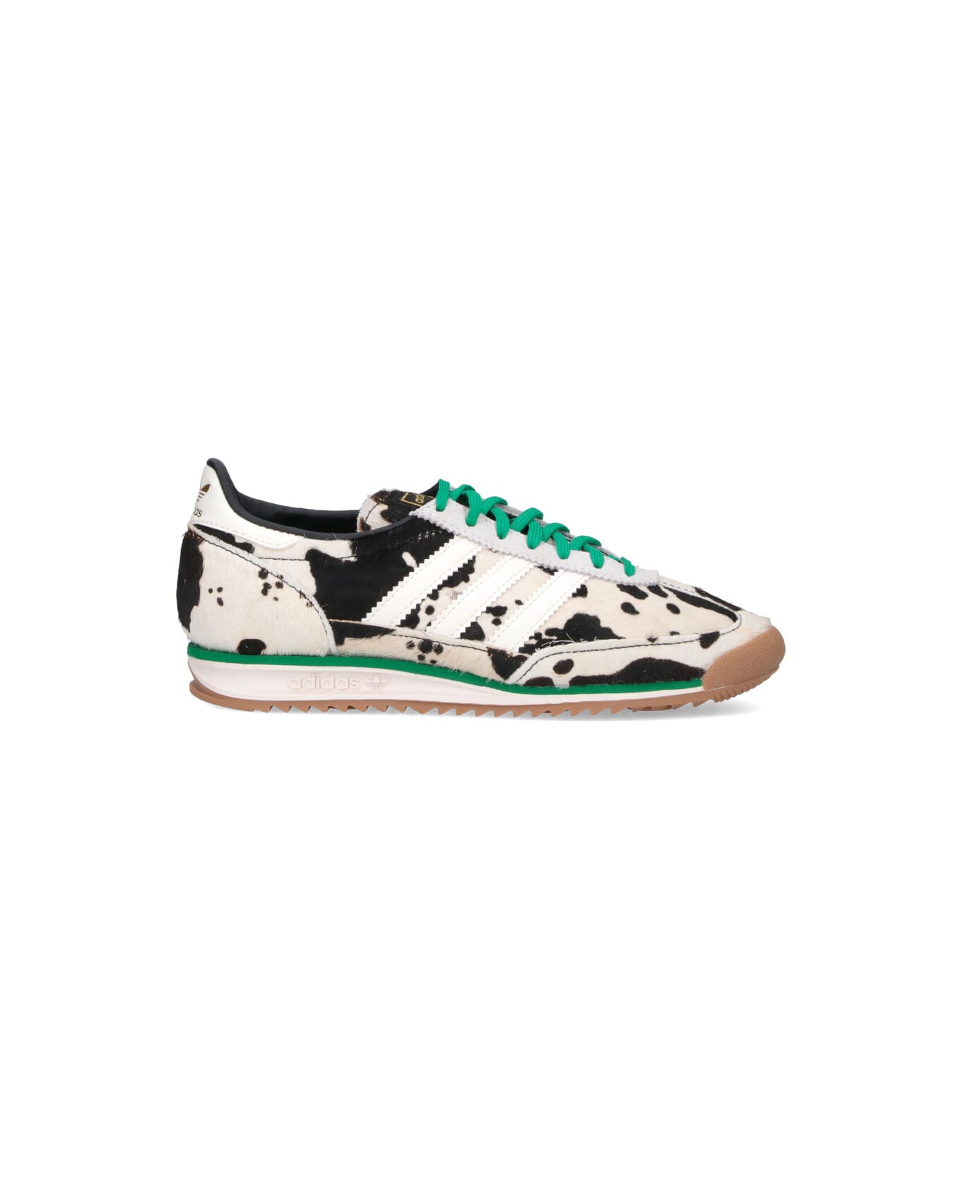 Adidas SL72 OG sneakers in multicolor pony hair with green fabric details, round toe, laces, gold logo print on the tongue, iconic contrasting leather bands, white leather back tab, gold logo print, rubber sole.