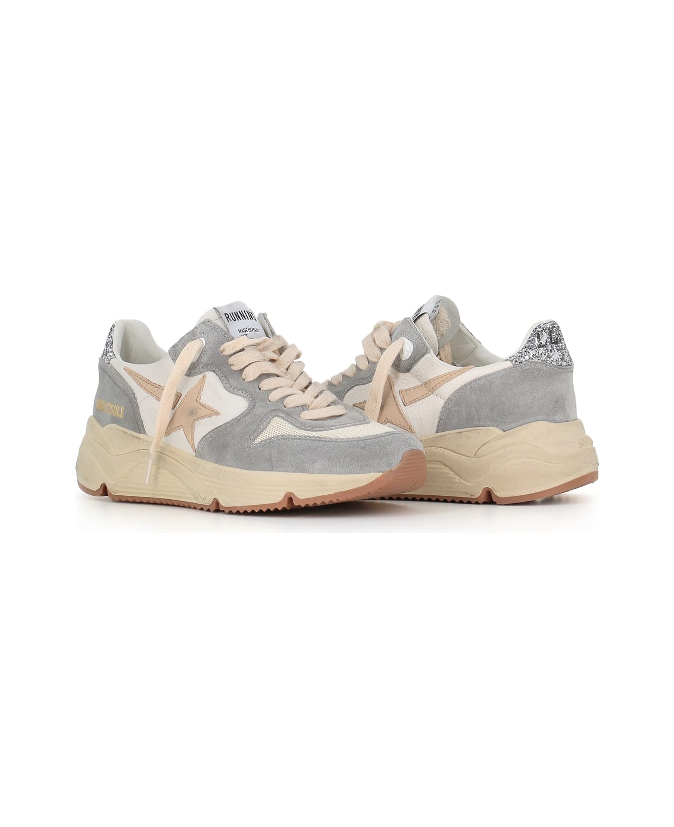 White and grey suede and leather Sneaker from Golden Goose, featuring by a visually appealing, from the RUNNING logo on the tab and gives an internal soletta of 2 cm. Beige leather star and glitter silver heel tab. Rubber sole. Heel: 3 cm