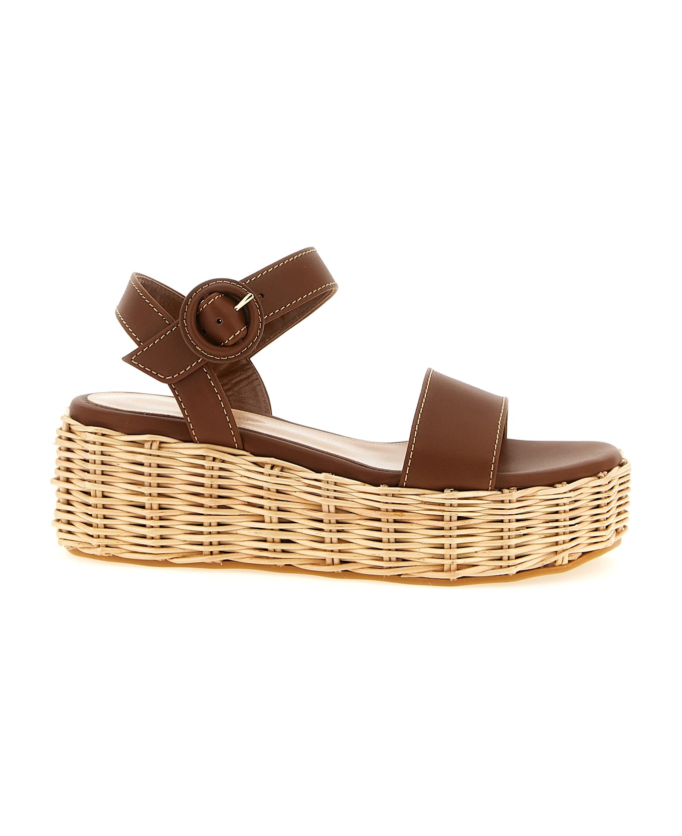 'Cestino' leather sandals with woven straw midsole, adjustable ankle strap, wedge, rubber sole.