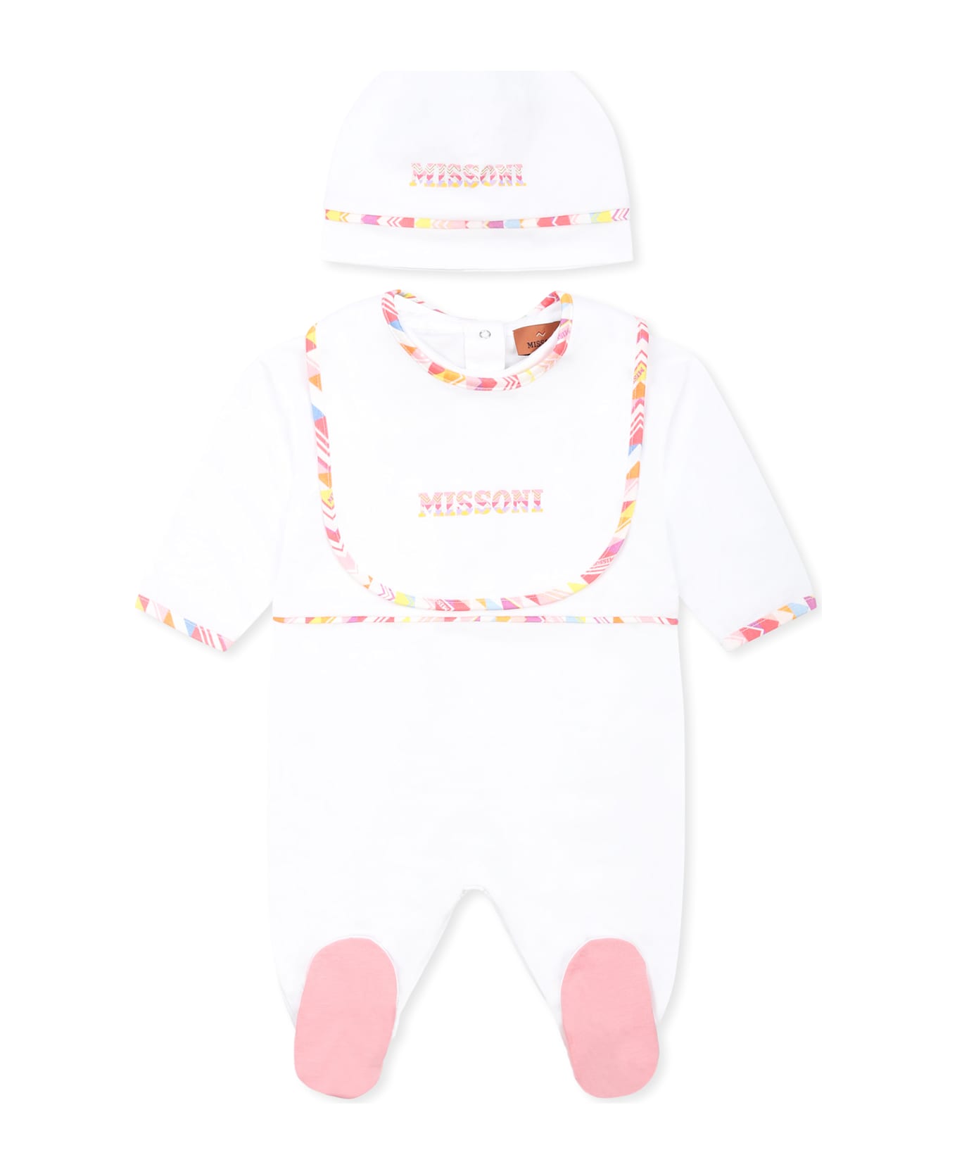 White cotton babygrow set, conmposed of babygrow, bib and hat. Long-sleeved romper, with peter pan collar, feet, snap button closure on the back and between the legs; bib with snap button on the back; hat with cuff. It is embellished with front logo and details with iconic multicolor chevron motif.