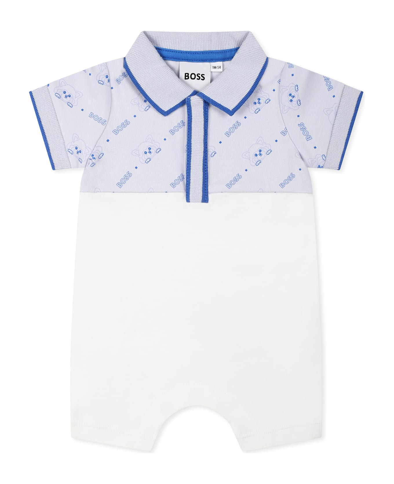 White cotton pique romper, light blue top, short sleeves, with collar and snap buttons on the front and between the legs. It is embellished with logo monogram and all-over panda, on the upper part.