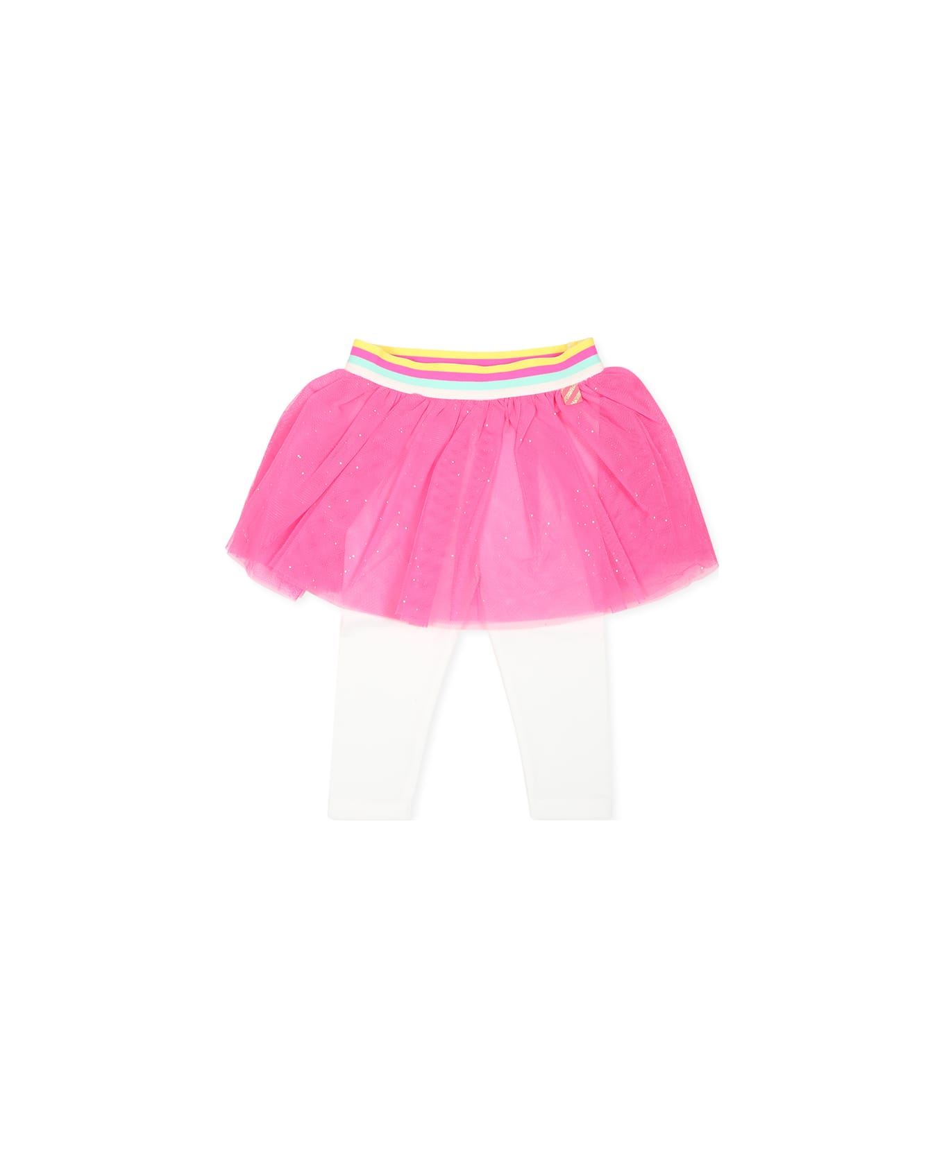 Fuchsia tulle skirt with striped elasticated waist and leggings. It is embellished with sequins all over.