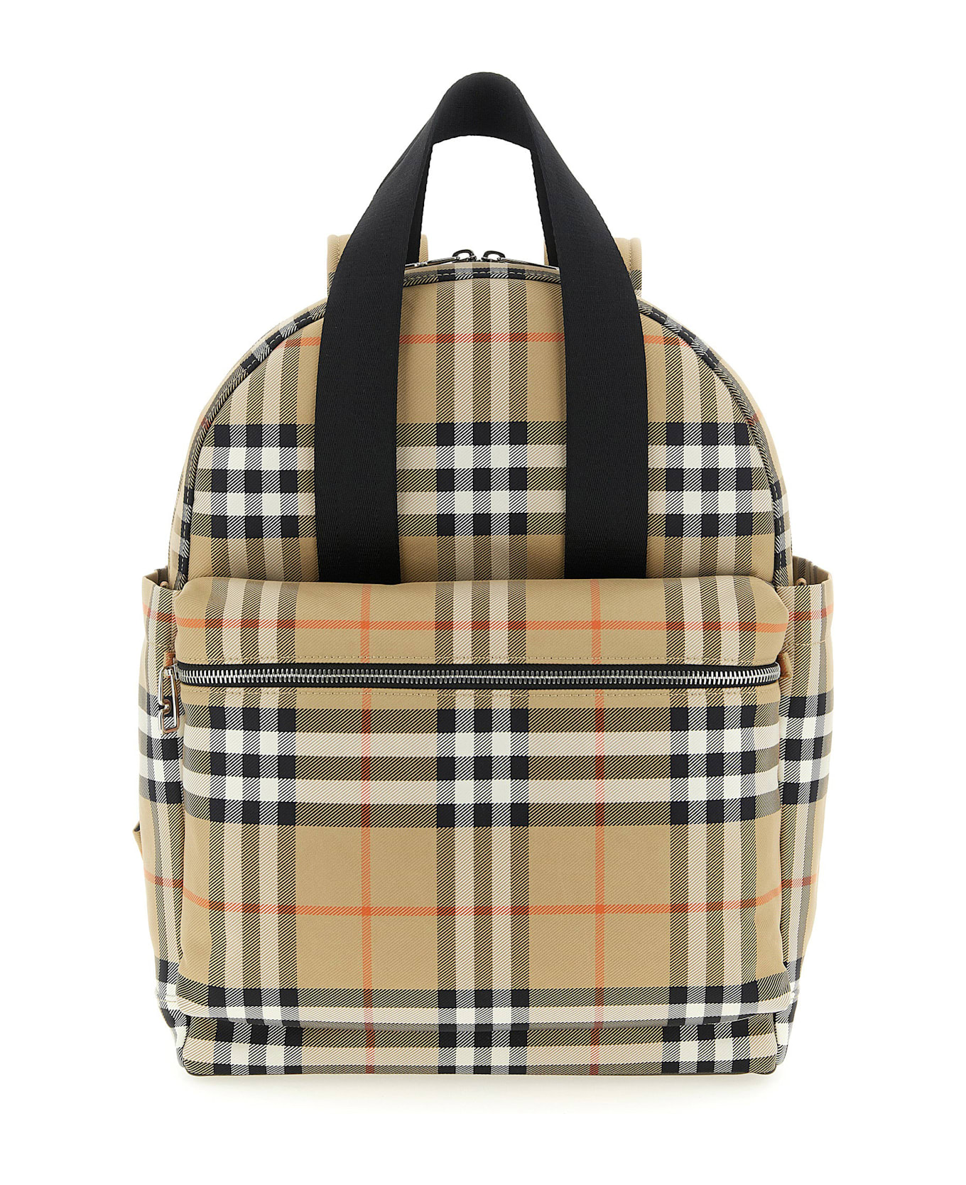 Norwich' woven nylon backpack with Burberry Check with leather details, nylon lining, top zip closure, double fixed tape handle, front zip pocket, side pockets, foldable padded mattress for changing, adjustable shoulder straps, padded backrest.