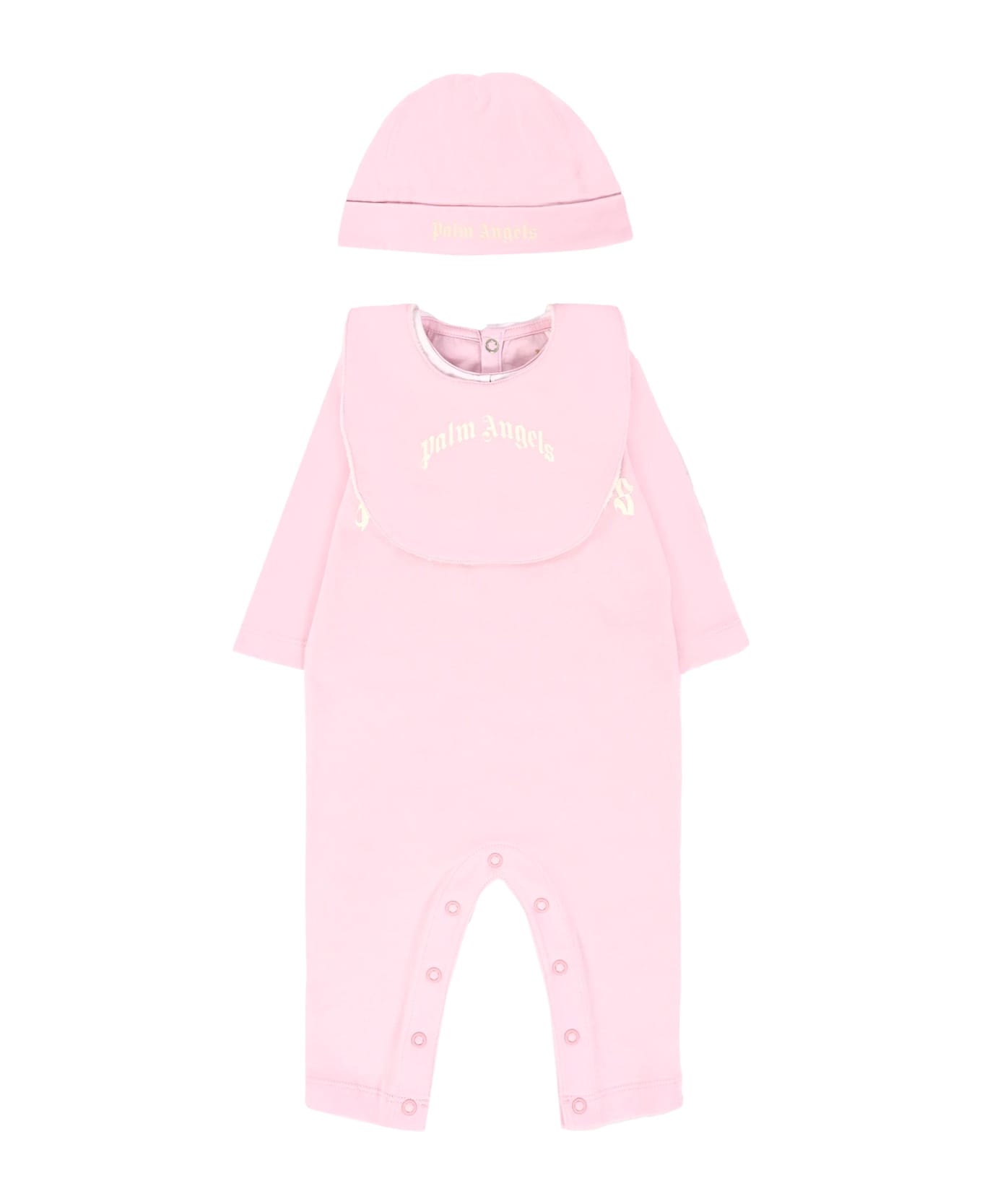 Pink cotton babygrow set, composed of babygrow, hat and bib. Lightweight cotton babygrow, long sleeves, with white Peter Pan collar, snap button fastening on the back and between the legs; hat with cuff; bib with snap button fastening on the back. It is embellished with a logo print on the front.