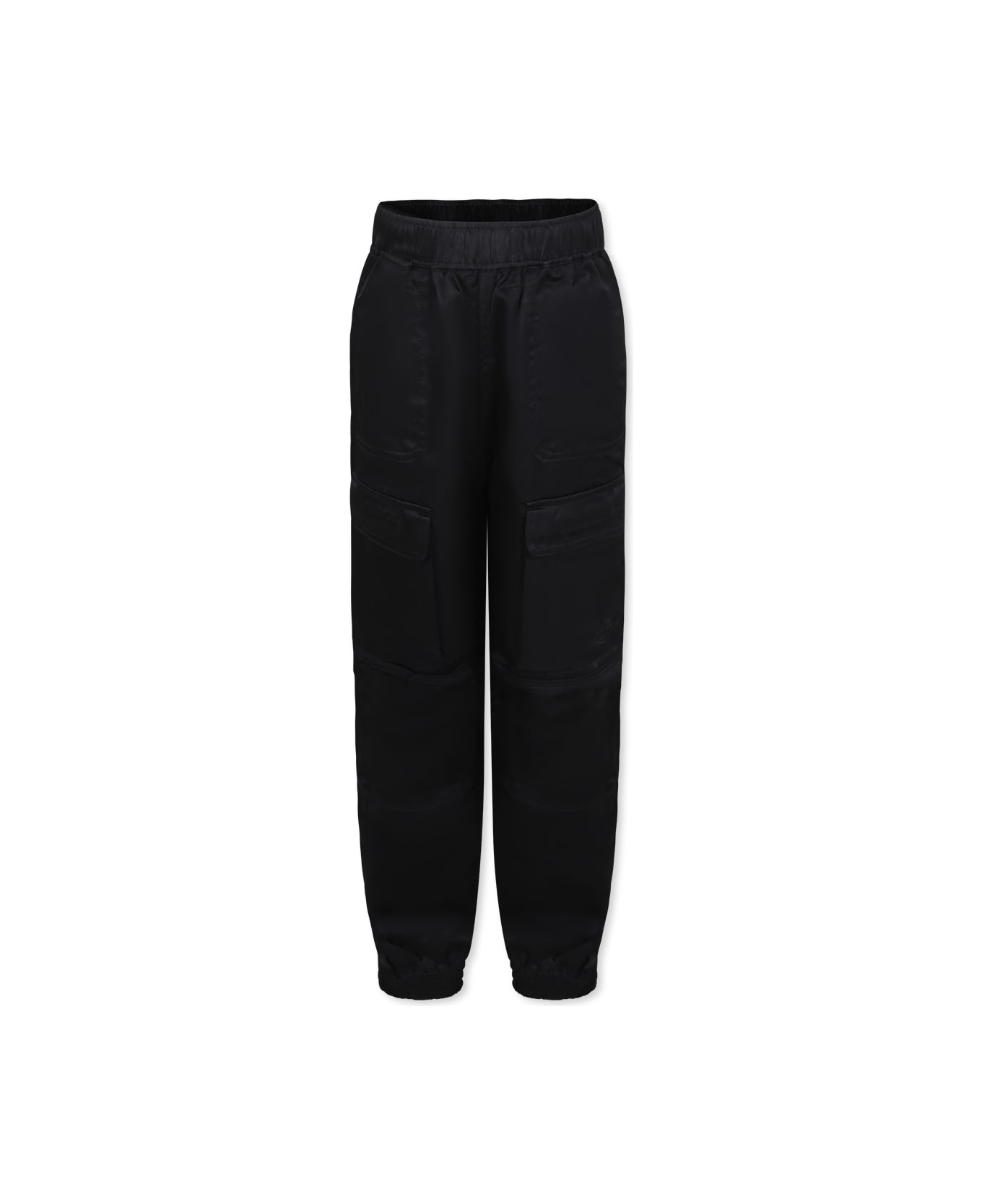 Black trousers in technical fabric, with elasticated waist, side pockets, pockets with hook and loop closure and flap on the front and elasticated ankles.