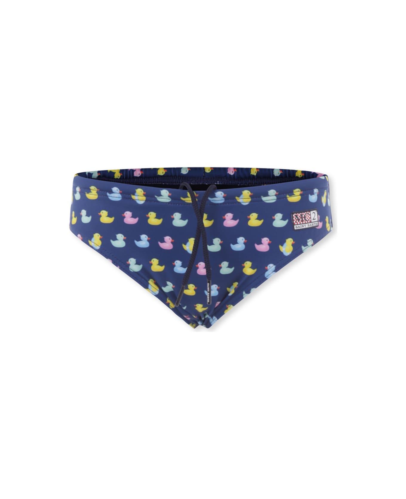 Blue swim shorts with elasticated waist and internal drawstring. They are embellished with an all-over duck print and logo patch on the front.