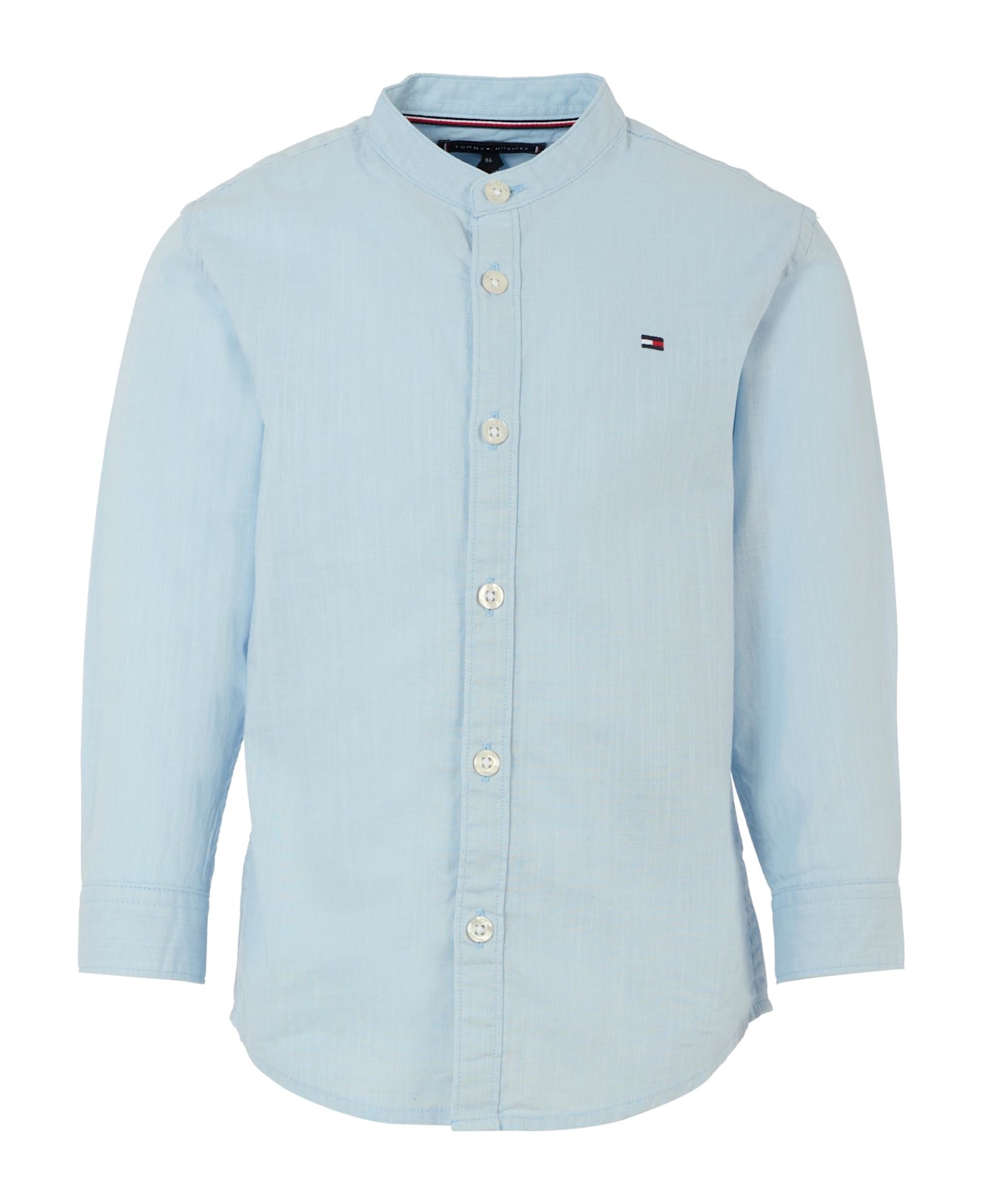 Light blue cotton shirt, long sleeves, with mandarin collar and front button closure. It is embellished with an iconic flag, embroidered on the chest.