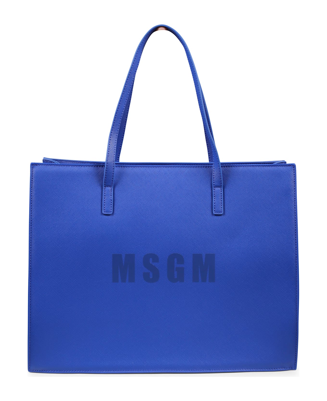 Blue eco-leather bag, with handles and top zip closure. It is embellished with front logo.