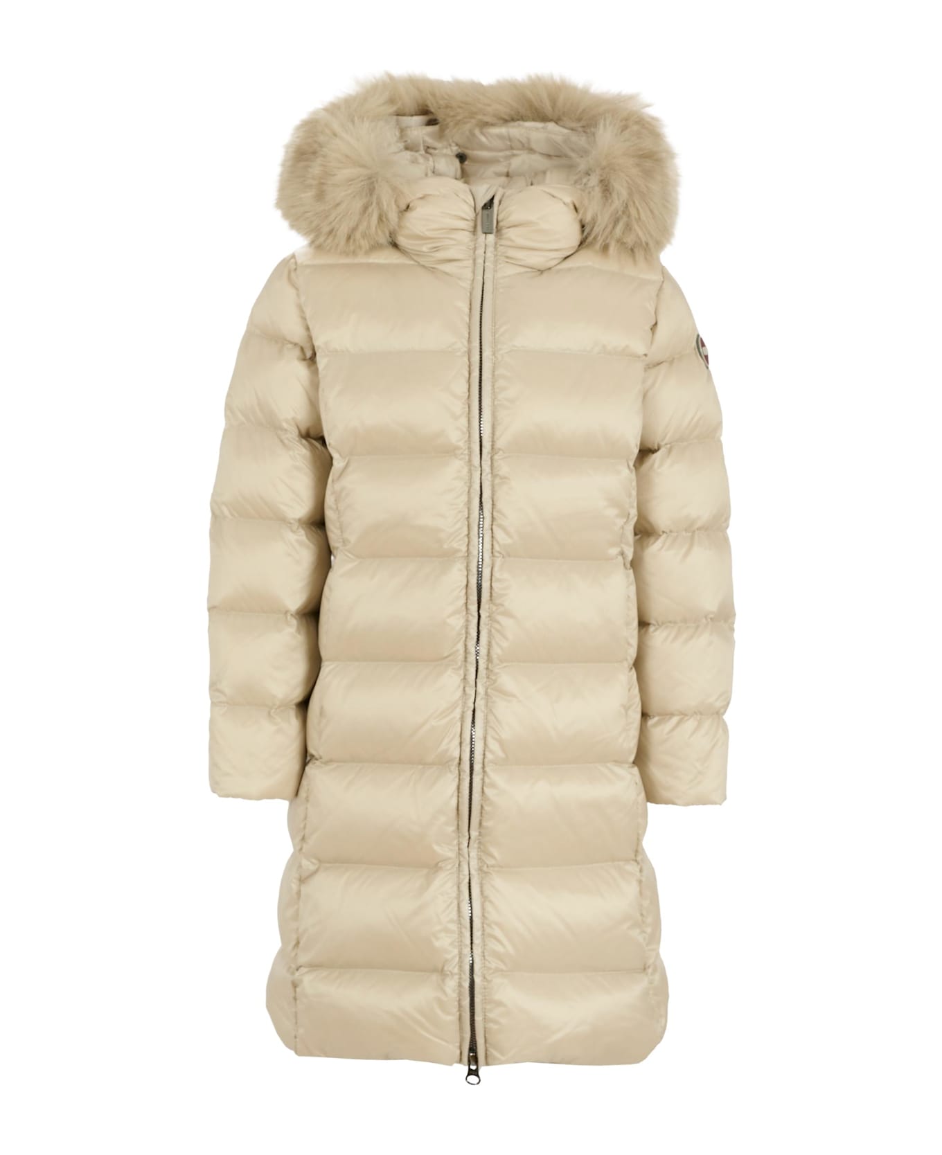 Heavyweight beige padded and quilted down jacket with long sleeves, a hood with a removable faux fur trim, a front zip fastening, and side zip pockets. It is embellished with a logo patch, applied on the sleeve.