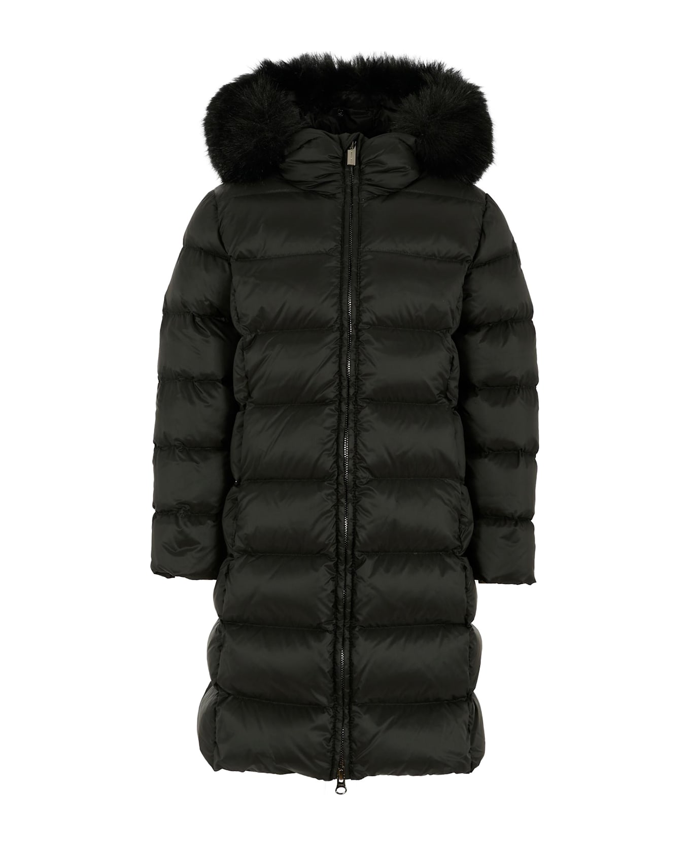 Heavyweight black padded and quilted down jacket with long sleeves, a hood with a removable faux fur trim, a front zip fastening, and side zip pockets. It is embellished with a logo patch, applied on the sleeve.