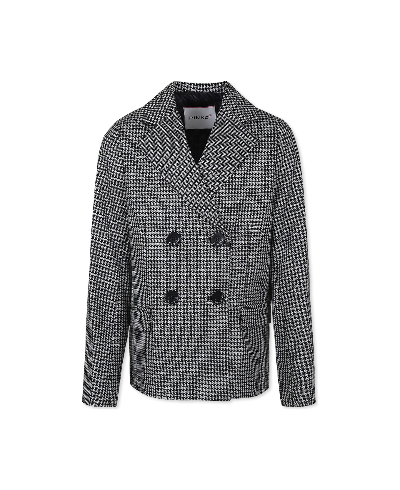 Black double-breasted houndstooth jacket, in lurex, with long sleeves, with collar and lapels, front closure with buttons, side pockets with flap. It is embellished with a logo patch embroidered on one sleeve.