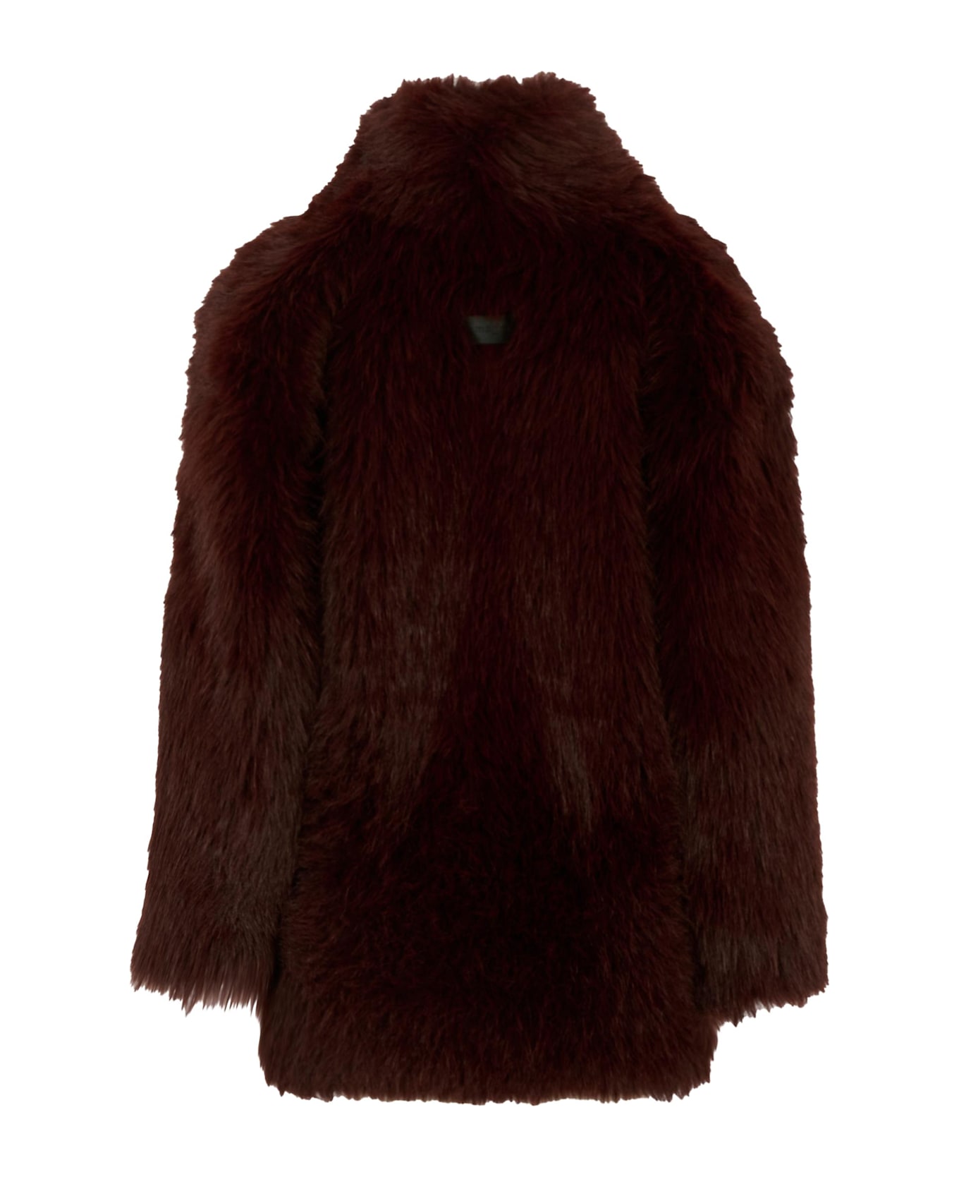 Red long-sleeved faux fur coat, with collar, front hook fastening and side pockets. It is decorated with a logo patch on the back.