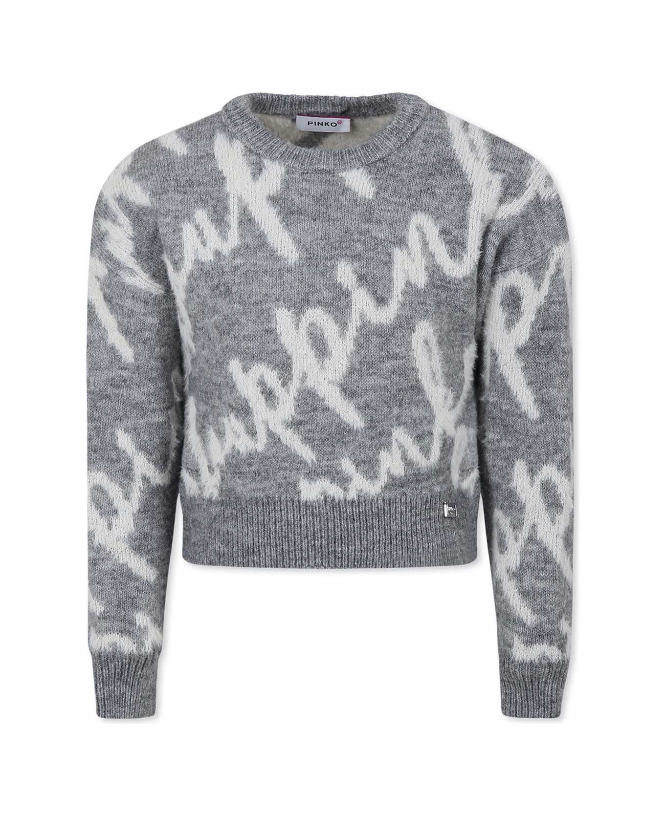 Grey long-sleeved crop sweater with ribbed crew neck, cuffs and hem. It is embellished with all-over contrasting jacquard logo and metal logo patch on the front.