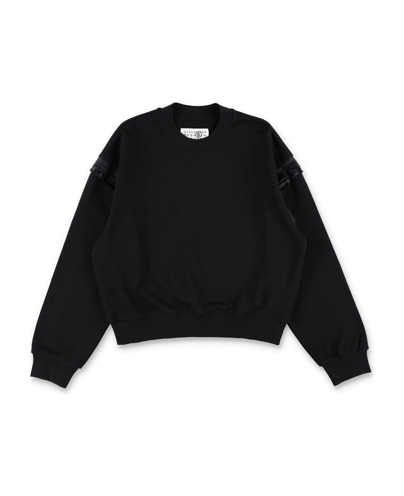 Mm6 Maison Margiela Kids Reinvents The Timeless Crewneck Sweatshirt With Sculptural Sleeve Details In Tonal Logo Fabric. This Black Cotton Piece Blends Minimal Aesthetics With Experimental Flair, Making It A Standout Staple For Fashion-forward Young Wardrobes. Ribbed Crew Neckline
