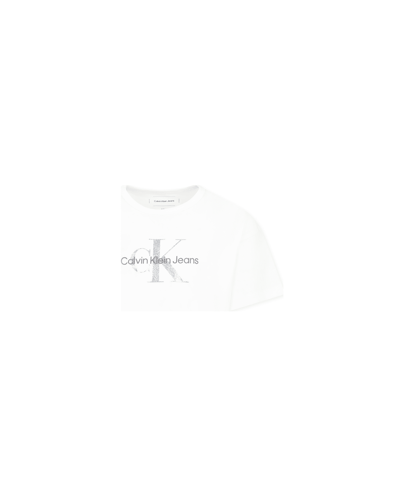 White cotton t-shirt, with short sleeves and ribbed crew neck; made with 95% regenerated cotton. It is embellished with rubberized logo and lurex monogram on the front.