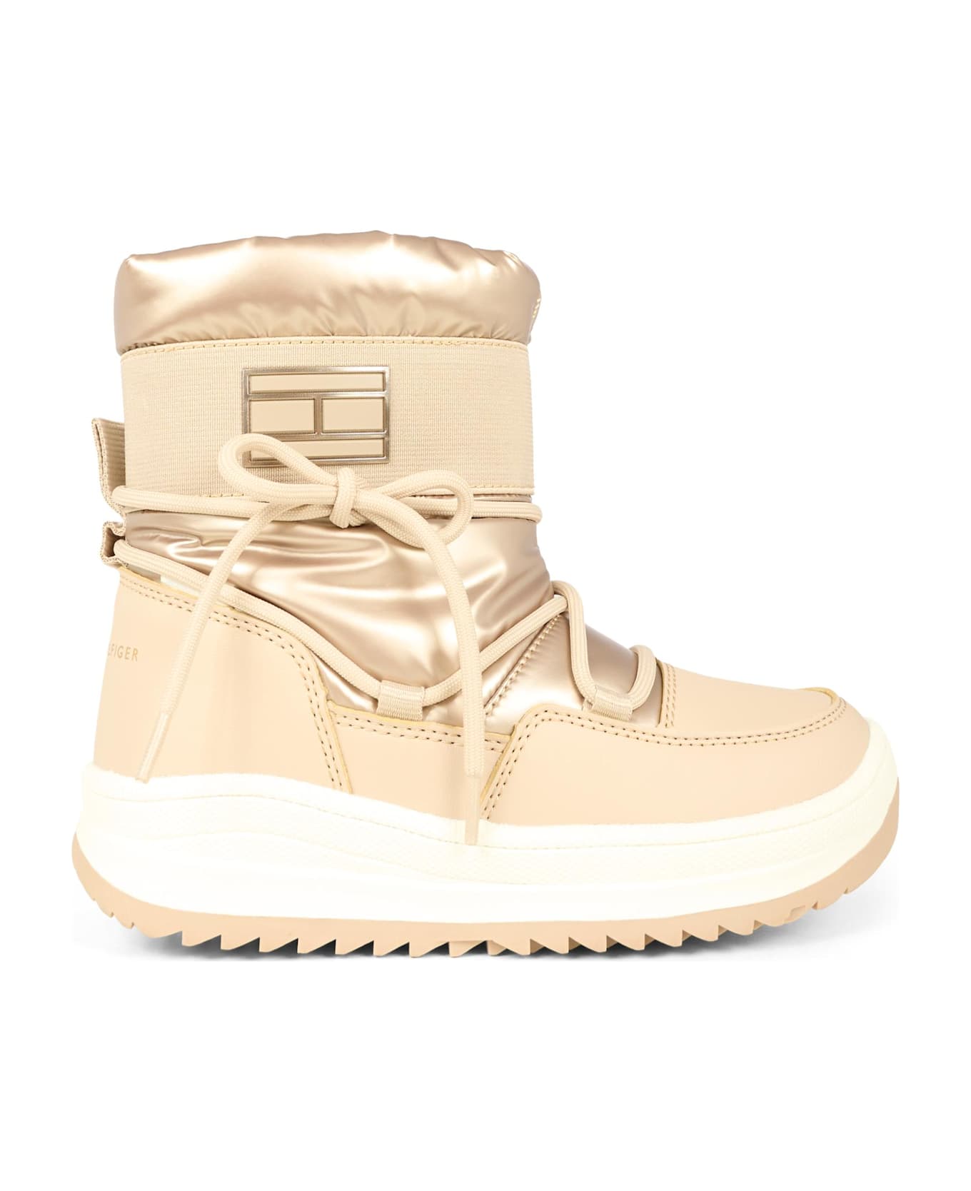 Waterproof and insulated pink snow boots with rubber soles, soft and warm faux shearling lining, a side zip, laces, and a round toe. They are embellished with the iconic flag on one side and the logo on the back.