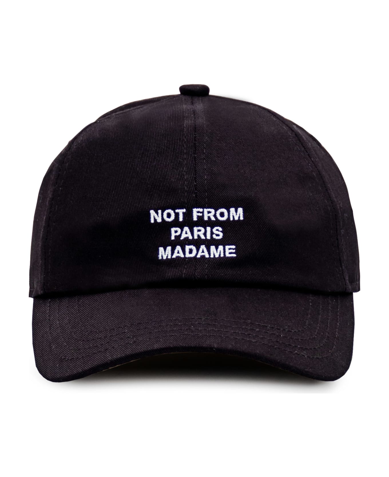 Black cotton hat with visor. Adjustable strap at the back. Embroidered logo on the front.