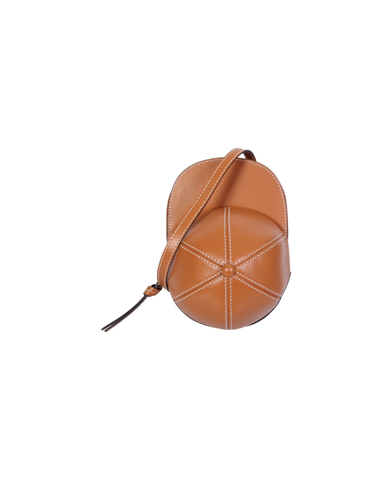 Top zip fastening. Main compartment. Internal logo patch. Cap shape. Panelled design.  Adjustable buckle shoulder strap. Engraved logo on the rear. Contrast stitching. Silver tone hardware. Color: brown