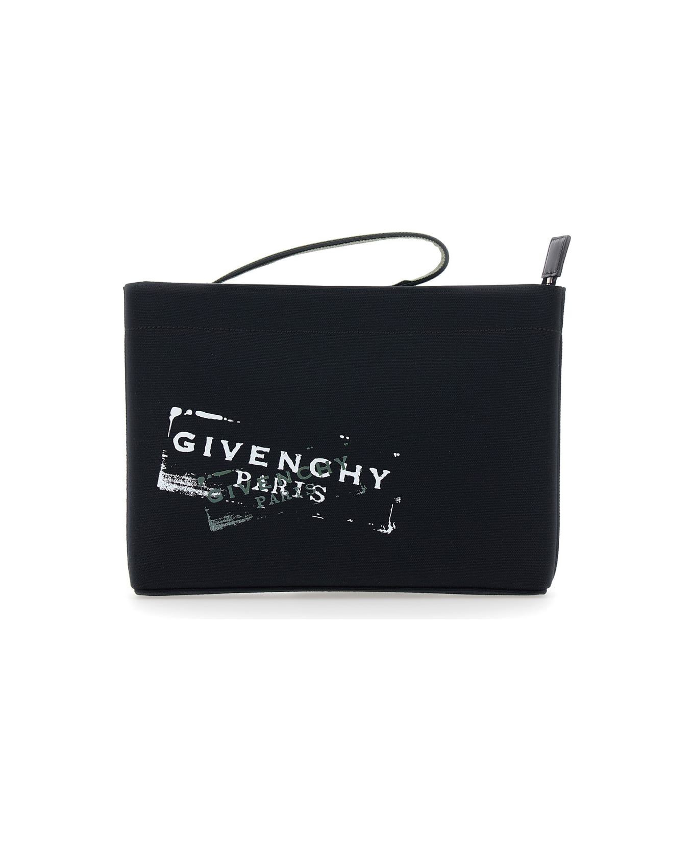 Black Clutch Bag With Top Handle And Logo Print On The Front In Cotton Man