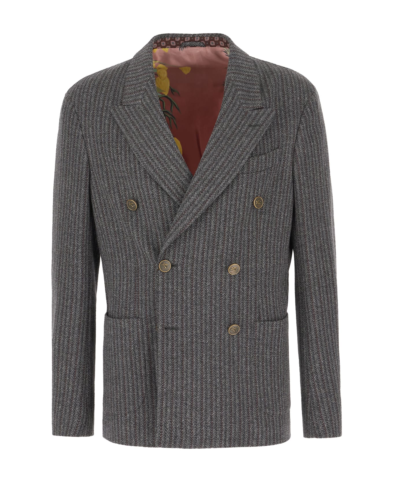 Blazer realized in wool blend characterized by peculiar embroidery on the entire surface. -Peak lapels -Double-breasted closure by three buttons with decorative buttons -Two slit pockets and a chest pocket -Four buttons on the sleeves -Lateral slits at the back -Lined with four slit pockets on the interior Composition: Exterior: 58% Wool 28% Cotton 14% Polyester Lining: 100% Viscose