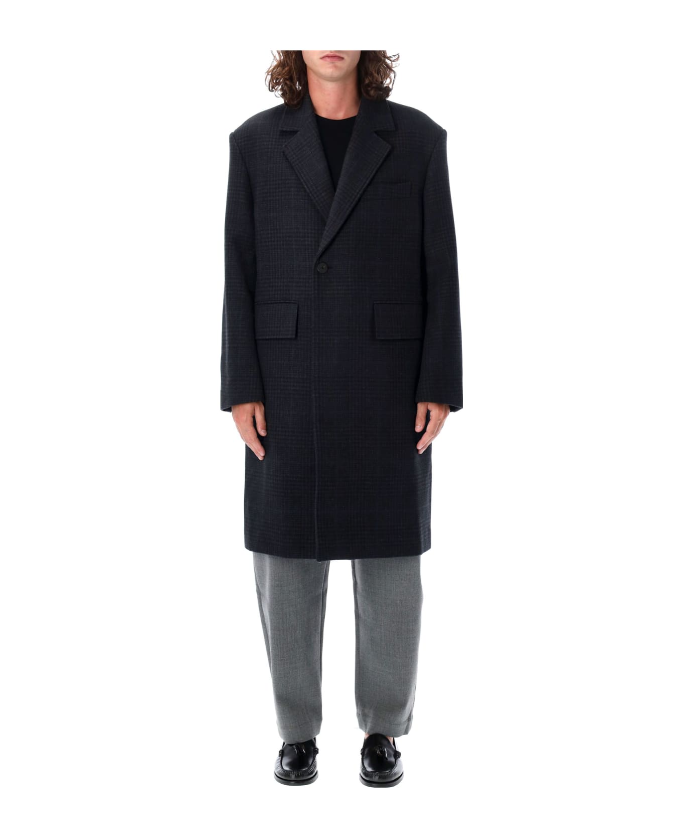 Brooke Over Coat By Studio Nicholson. Featuring: Wool Fabric Relaxed Fit Subtle Check Pattern Notched Lapel Collar Long Sleeves With Clean Cuffs Single-breasted Front With Button Closure Flap Pockets And A Chest Welt Pocket Model Is 1,90m And Wears Size L.