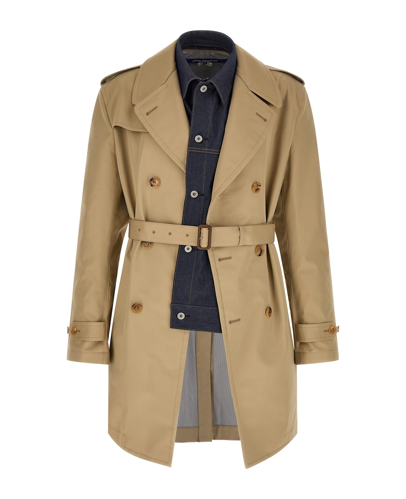 Double-breasted cotton gabardine trench coat with front horn button closure, lapel collar, pockets, shoulder badge, long sleeves with adjustable cuffs, cape and back split, front denim insert with contrast stitching, shirt collar and metal button closure, removable matching belt.