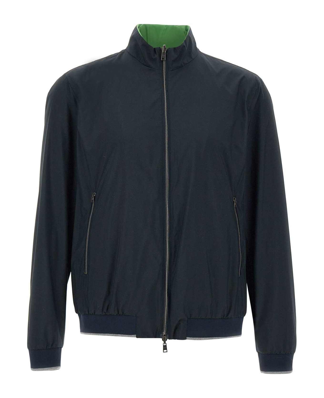 Herno men's jacket "Flight" collection, reversible in navy blue and pistachio green, in satin jersey, water repellent, windproof and breathable, modern and minimal design, front fastening with zip, ribbed cuffs and hem with contrasting color profiles, regular fit , two side pockets with logoed zip in blue variant and two side pockets with button in green version, an ideal garment for its lightness spring and summer seasons. Made in Italy.