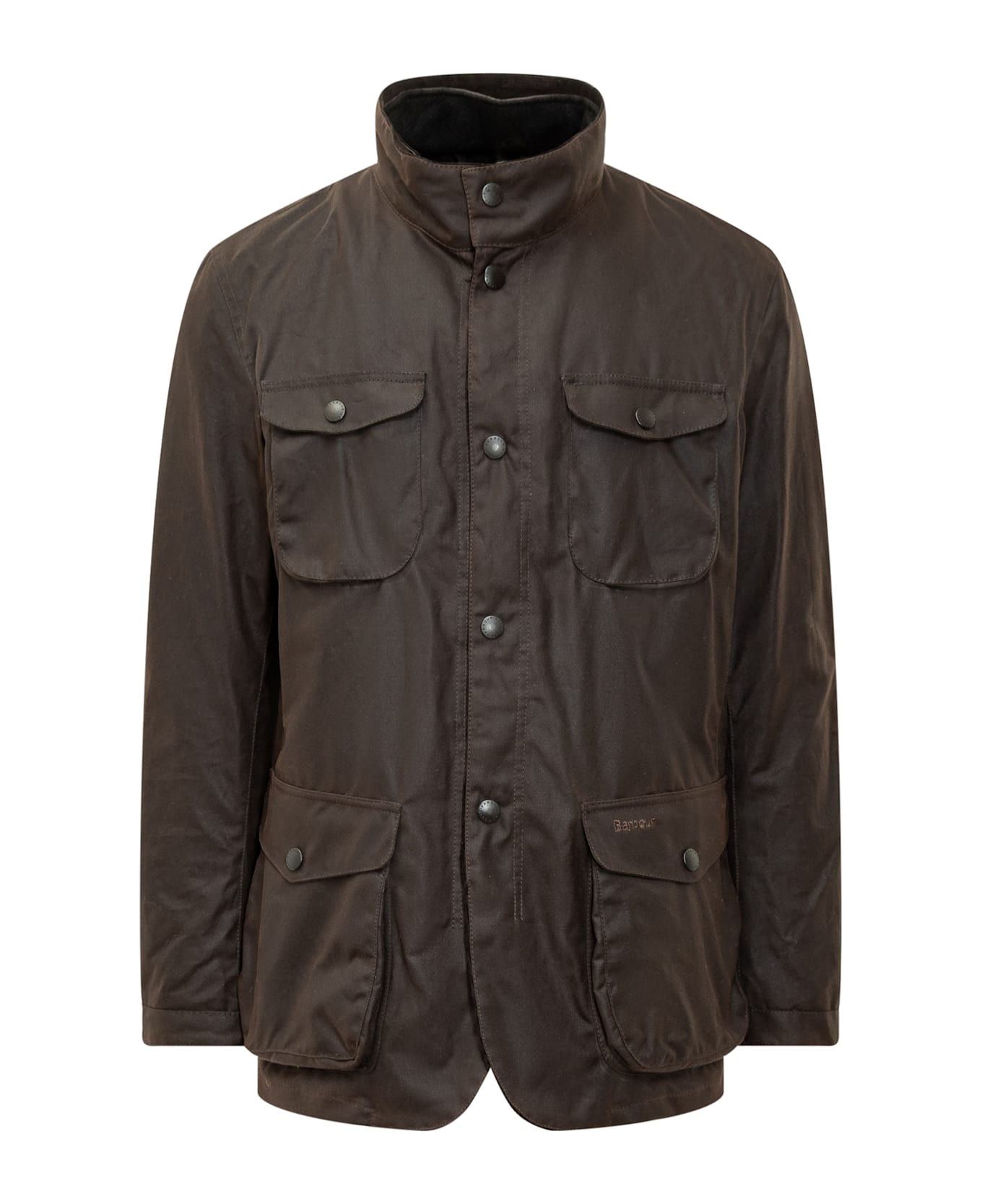 Brown jacket with waxed cotton cover. High neck. Four front pockets with flap and buttons. Embroidered logo on the front. Closure with zip and buttons.