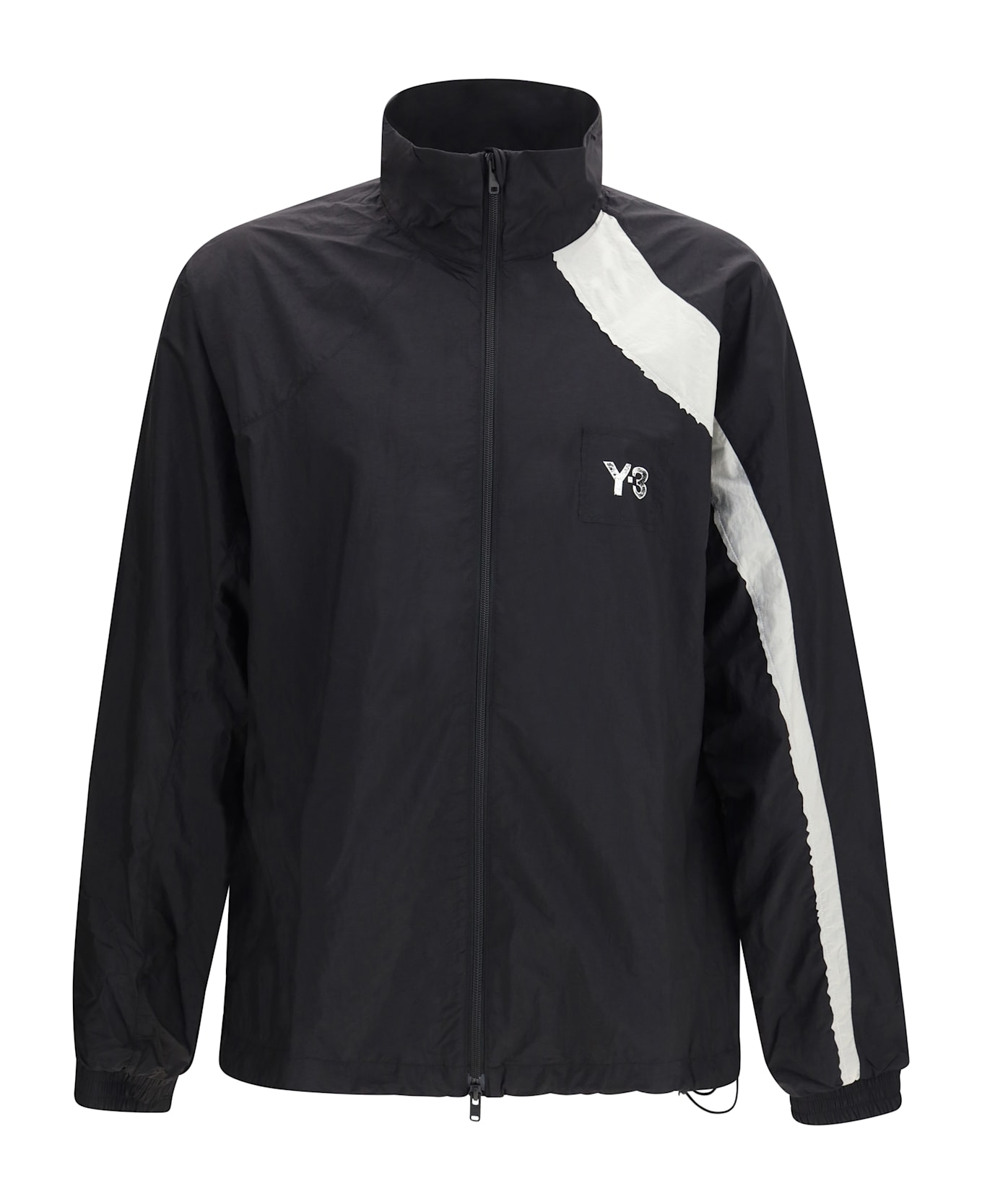 The raw edge nylon jacket by y-3 combines contemporary design with sporty functionality. made from black nylon, it features a front zip closure, a distinctive striped pattern, long sleeves, and elasticated hems for a comfortable and versatile fit. perfect for urban looks with a modern, dynamic touch.