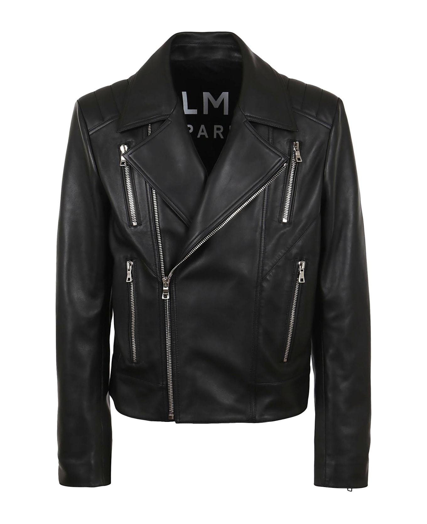 Leather biker jacket BY BALMAIN. Long sleeves with zip; asymmetric closure; pointed lapels. Regular fit design. Stitching detail on the back and shoulders and four pockets with maxi silver zip.