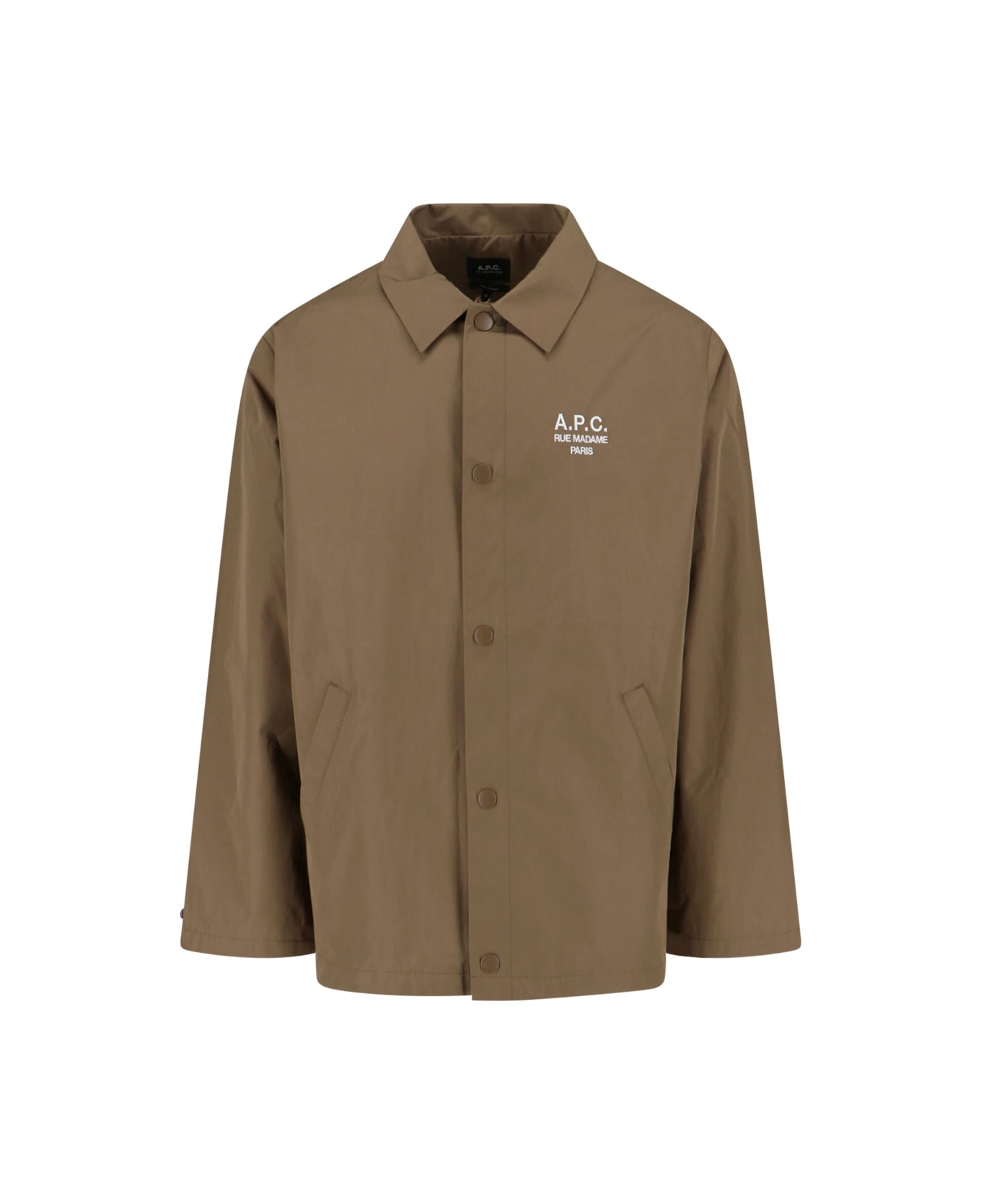 A. P. C. raymond jacket in brown cotton blend with classic collar, front button closure, contrasting logo on the front, long sleeves, two slanted side pockets, one inner pocket, and straight hem.