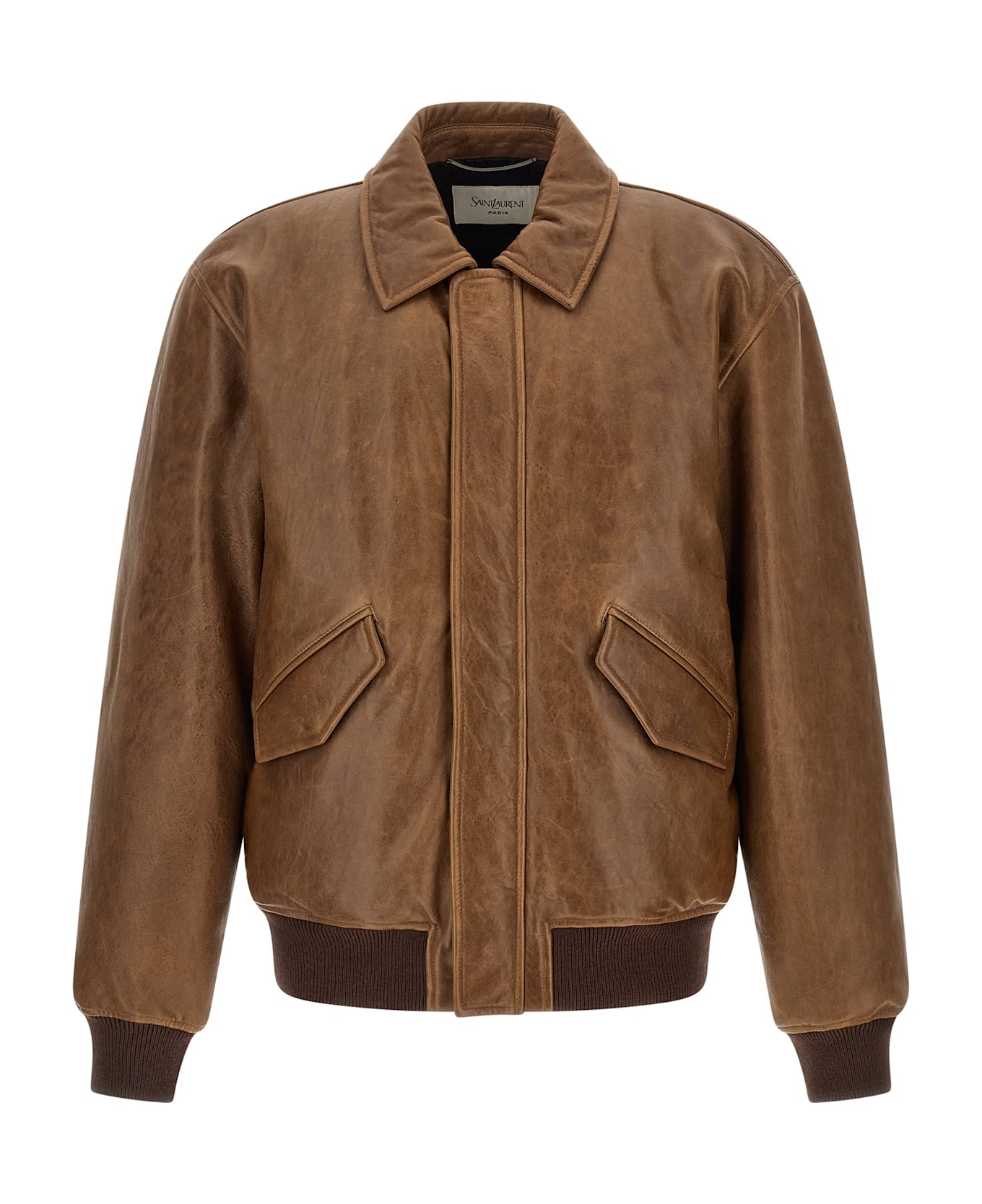Vintage hammered lambskin bomber jacket with ribbed stretch wool knit details, shirt collar, zip and front snap button closure, pockets, long sleeves with cuffs and dropped shoulder, headband, viscose blend and padded cotton lining, and interior pocket.