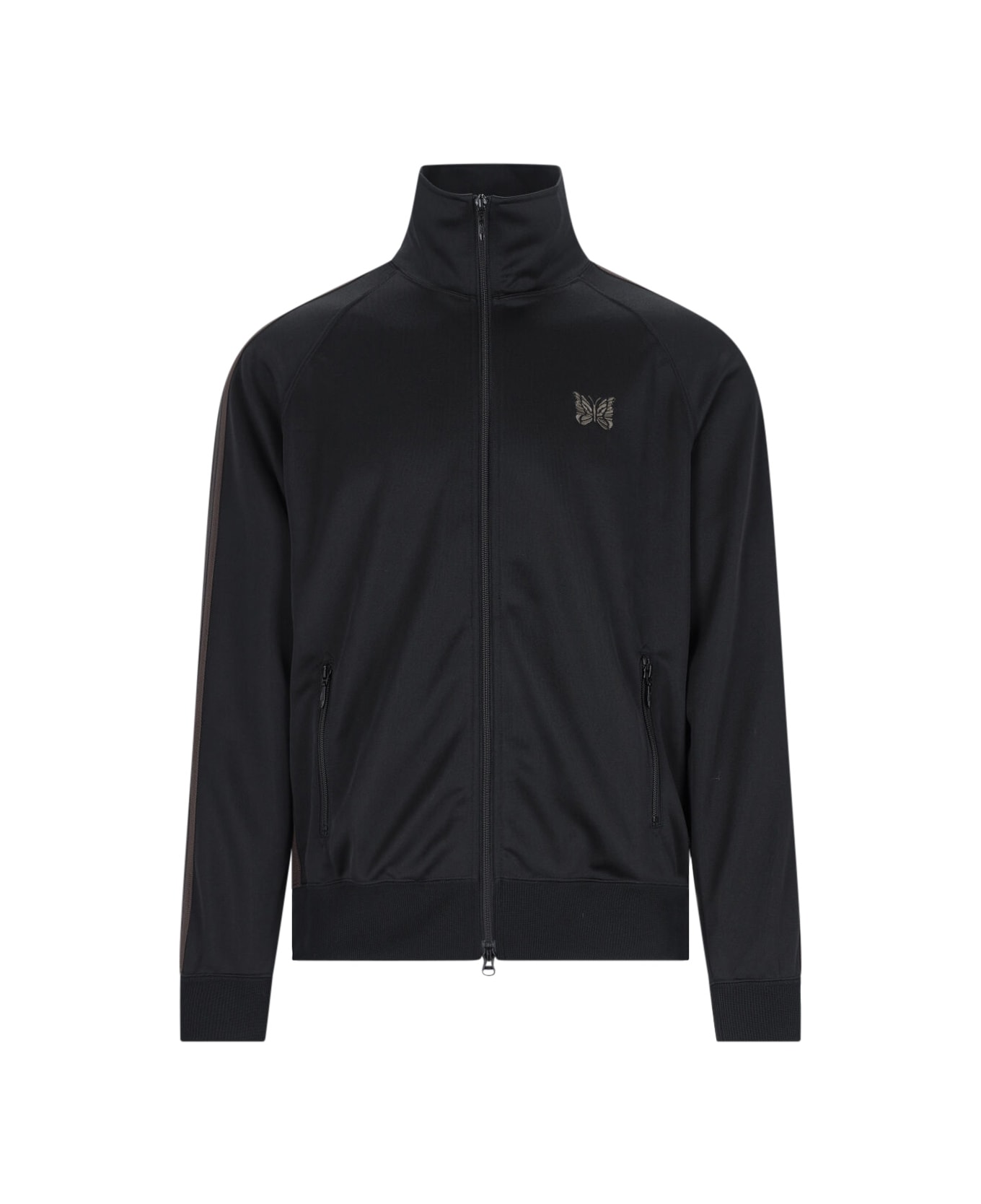 Needles 'Poly' black fabric turtleneck sweatshirt with double zip closure, brown animal print logo embroidery on the chest, two side zip pockets, iconic brown bands on the sleeves, ribbed trim, straight hem.