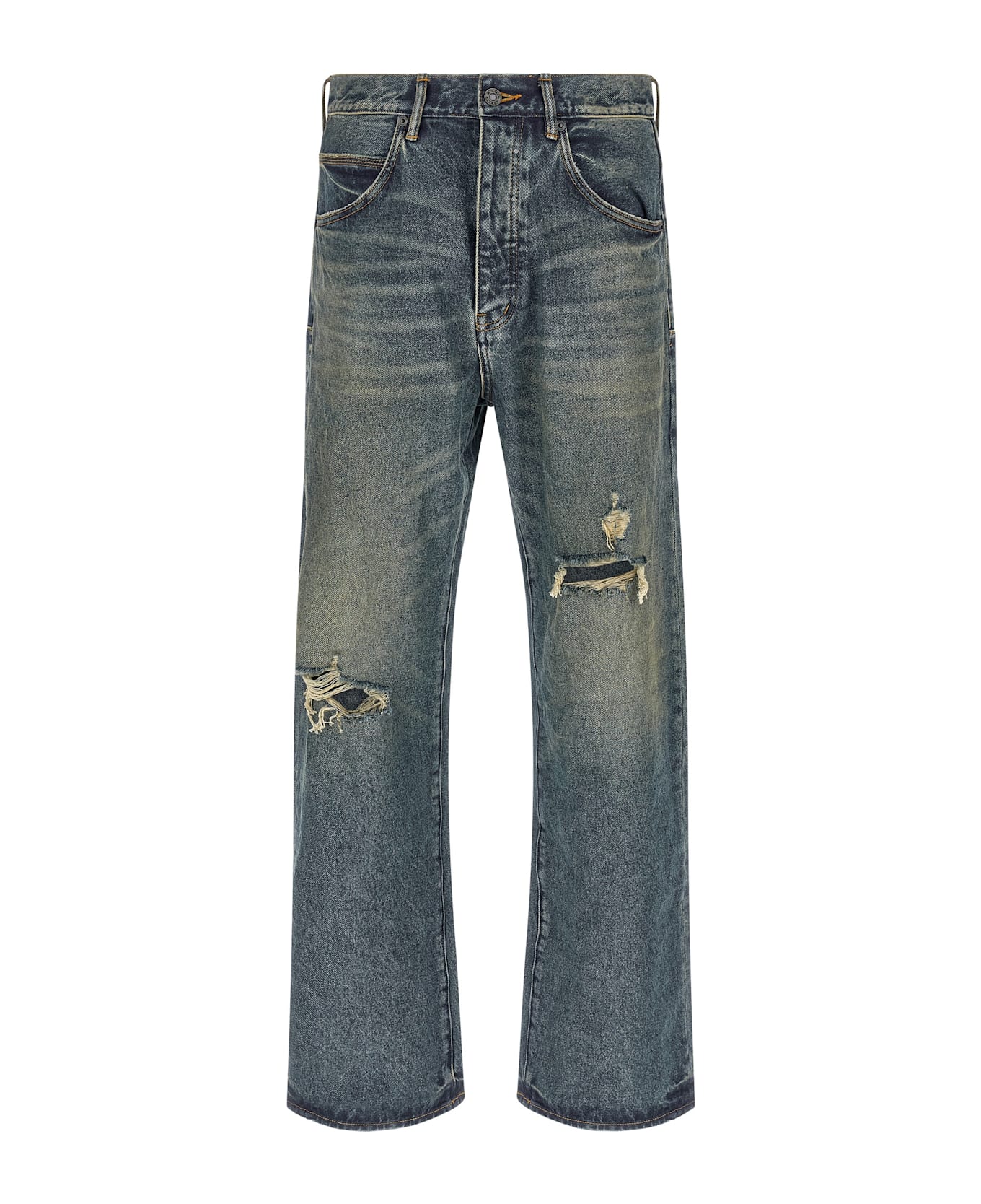 'P018 - 9 to 5' used-effect stonewashed cotton denim jeans with front rips, contrast stitching, low crotch and wide leg, front button closure, five pockets, back logo tag. Composition: 100% cotton