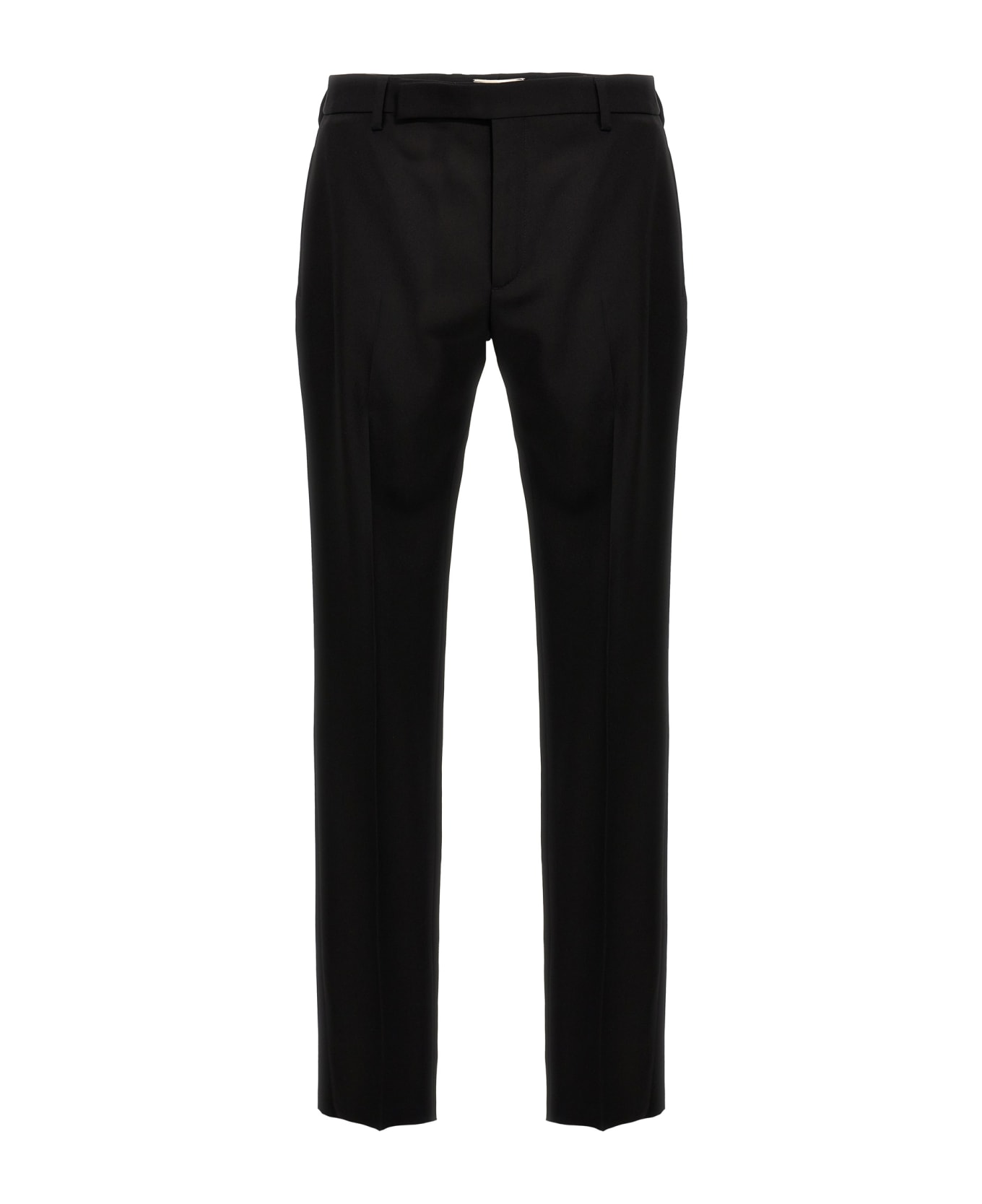 'Iconic Le Smoking' low-waist wool trousers, satin band detail at the sides, zip and button closure, pockets.