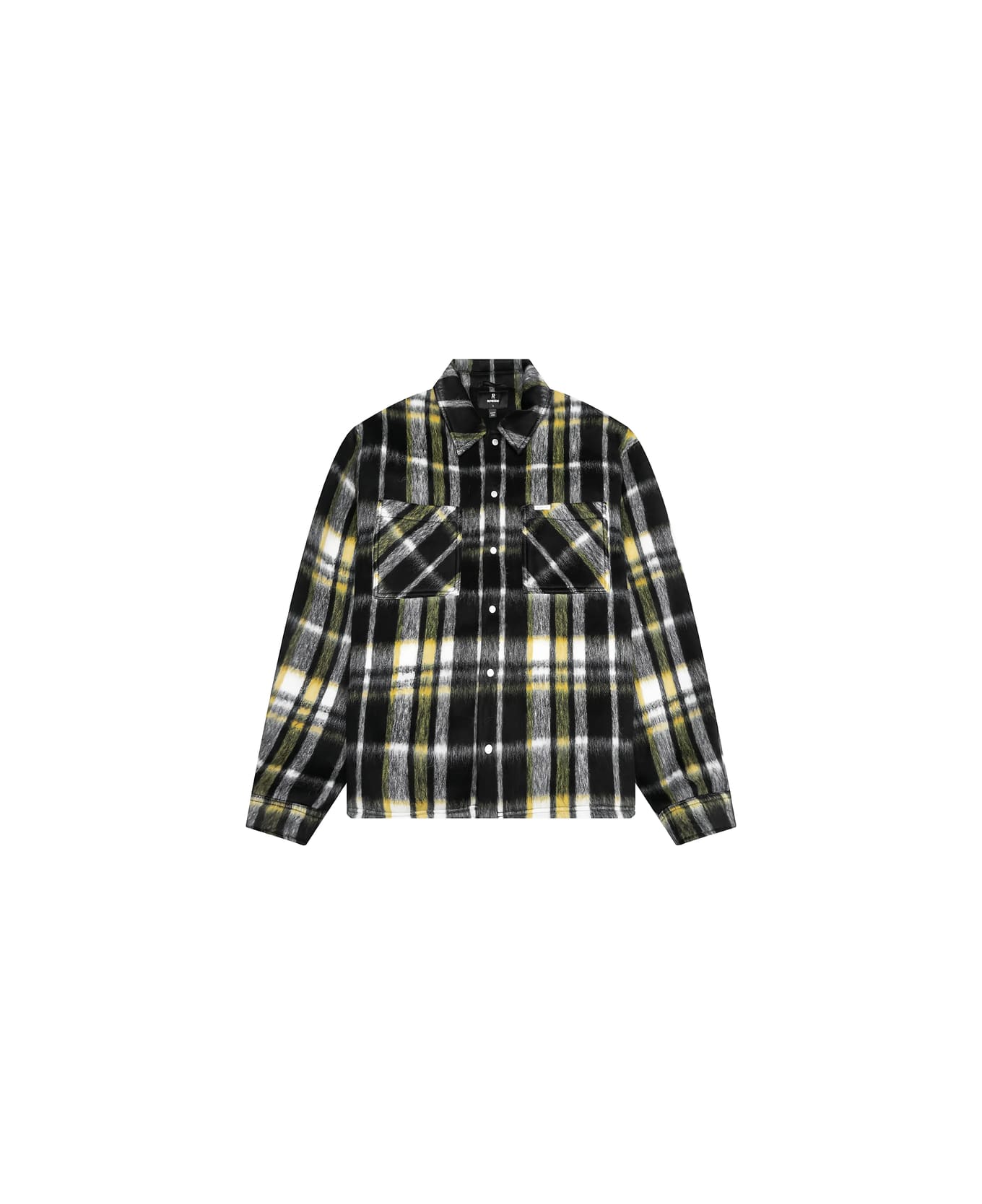 black plaid pattern chest patch pockets front button fastening long sleeves buttoned cuffs