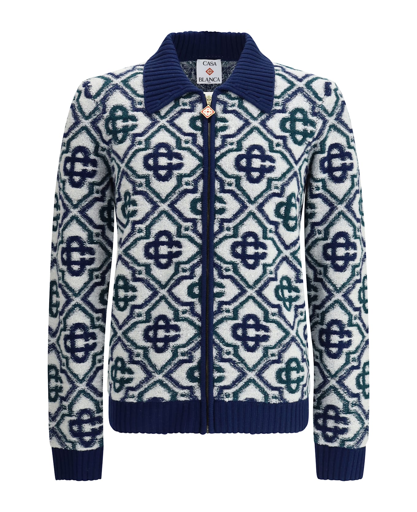 The casablanca knit jacket is a garment that combines comfort and distinctive style. featuring a ribbed collar, hem and cuffs, it offers a comfortable, structured fit. the front zipper closure ensures practicality, while the brand's iconic all-over printed pattern adds a bold and recognizable touch.