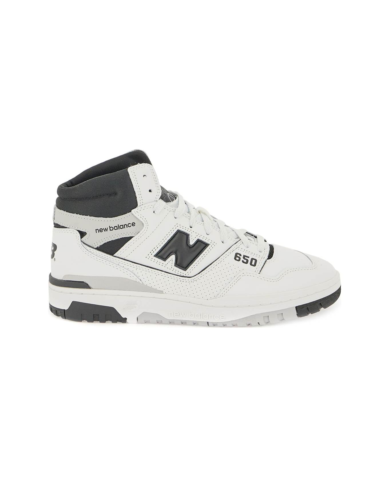 New Balance 650 basketball shoe-inspired sneakers featuring a leather upper with iconic contrasting embossed "N" motif on both sides, printed logo on the heel and lettering logo printed on the sides. 650 print on the toe, contrasting fabric spoiler, logo tag on the