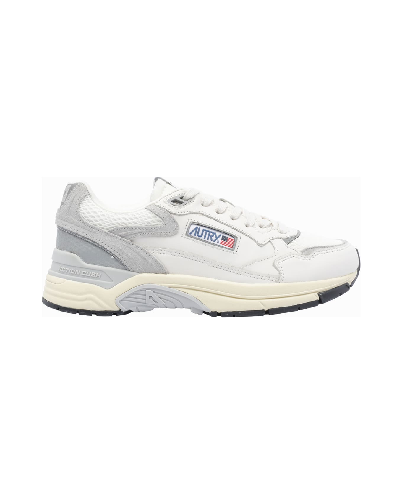 Autry white Hyperway sneakers, round toe, lateral logo, leather and fabric upper, laces closure