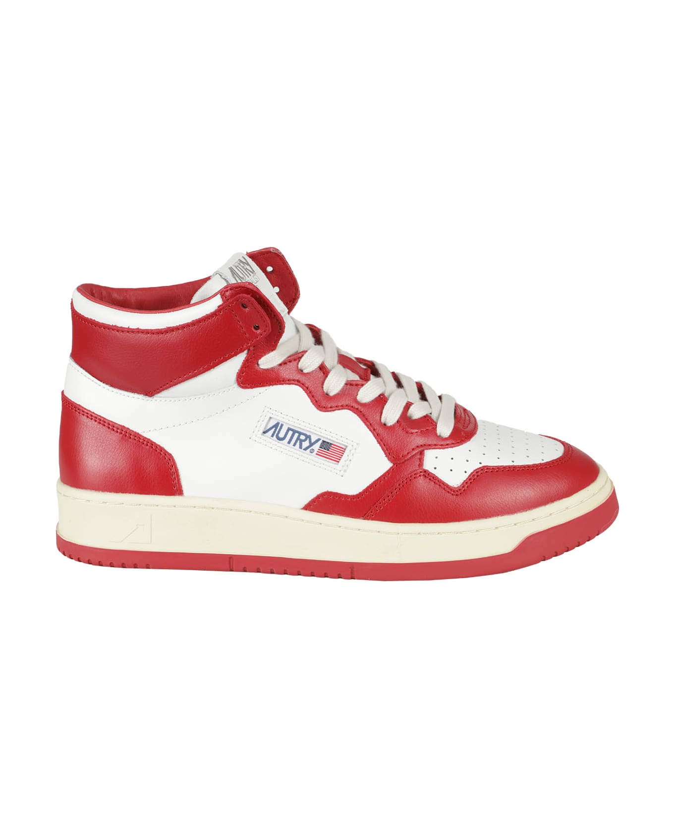 White-colored genuine leather midi sneakers with contrasting red details by Autry model Medalist Mid Man , round toe design, cotton laces, genuine leather upper, rubber sole and iconic American flag logo placed on the side.