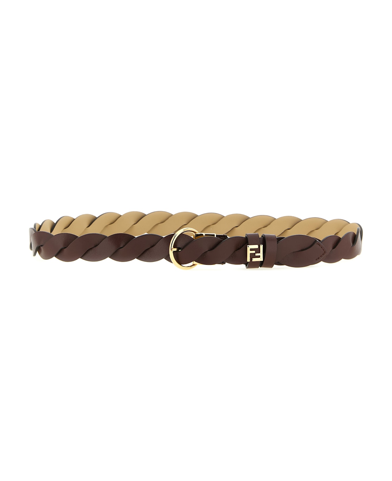 Reversible braided smooth leather belt, loop with FF detail and metal buckle. Color side A: brown