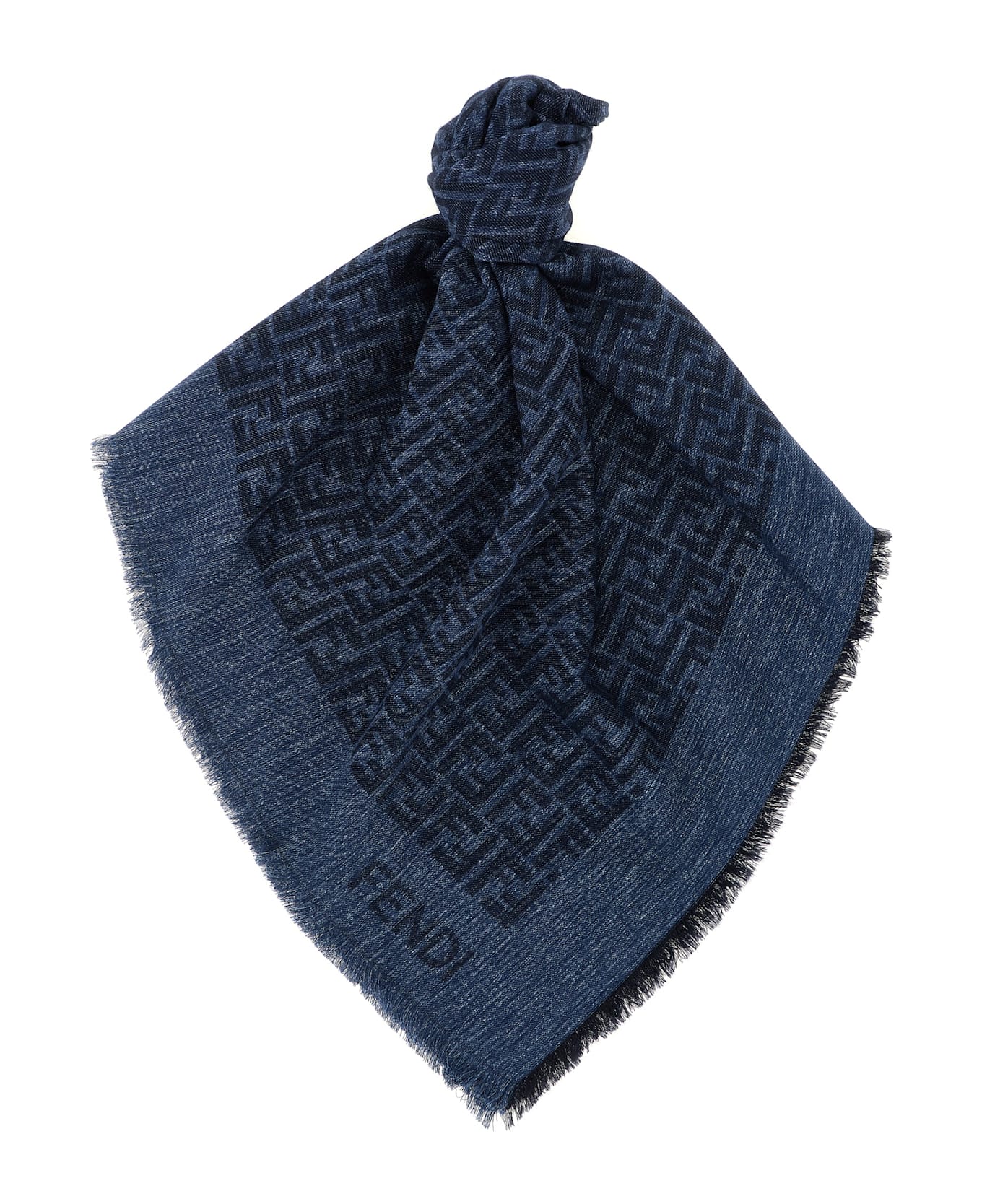 Denim-effect cotton and wool blend shawl with all-over jacquard FF pattern and fringed edges. Composition: 64% cotton, 36% wool