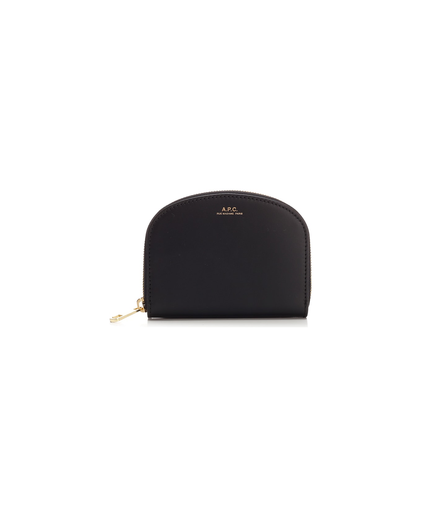 Compact wallet "Demi Lune" by A. P. C. in black leather with zip closure, three-position card holder on each side, central zip pocket, gold metal details and writing.