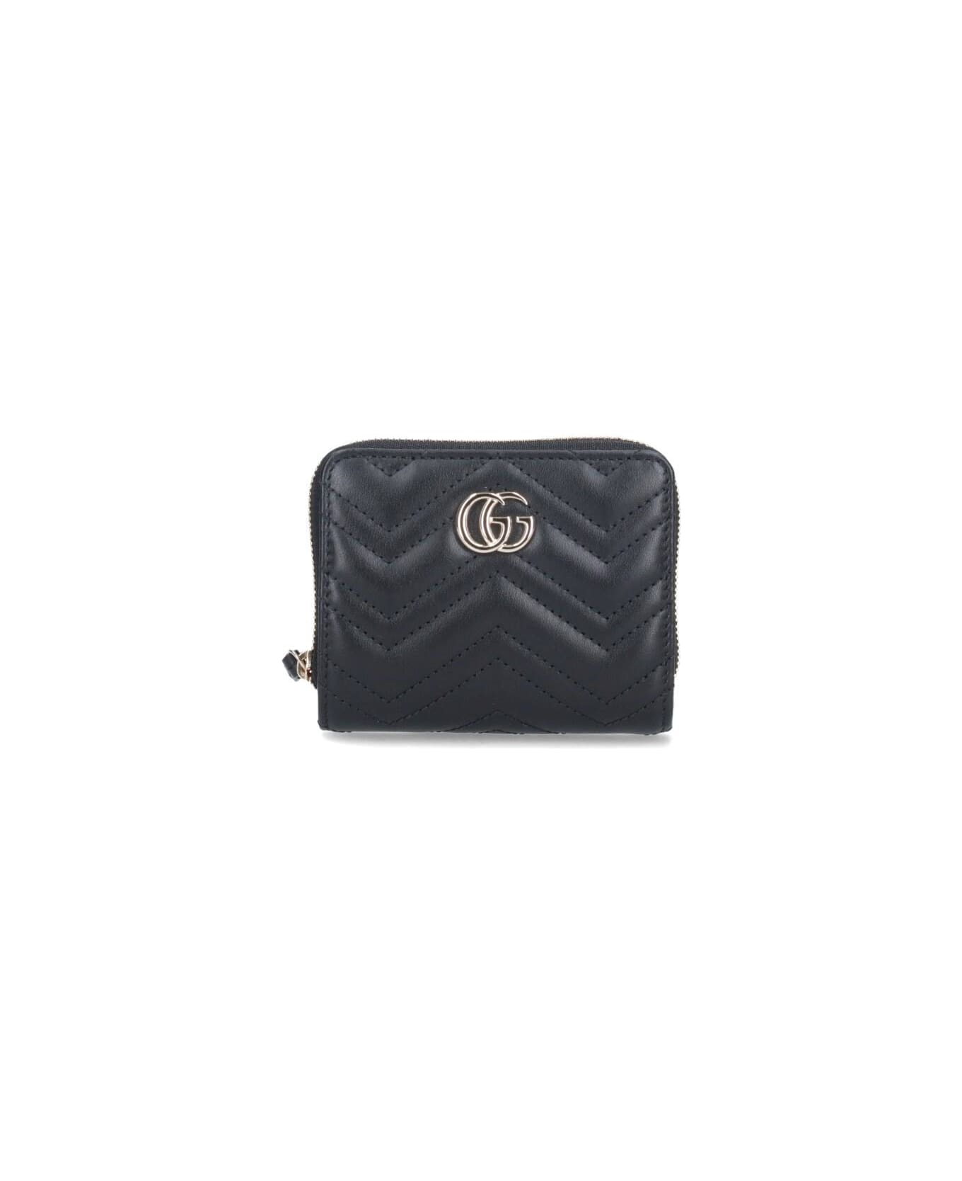 Gucci 'GG Marmont' mini zip wallet in black matelassé leather with 'Chevron' pattern, snap button flap closure, double 'G' logo detail in gold metal, top zip pocket, six inner card slots, inner bill compartment.
