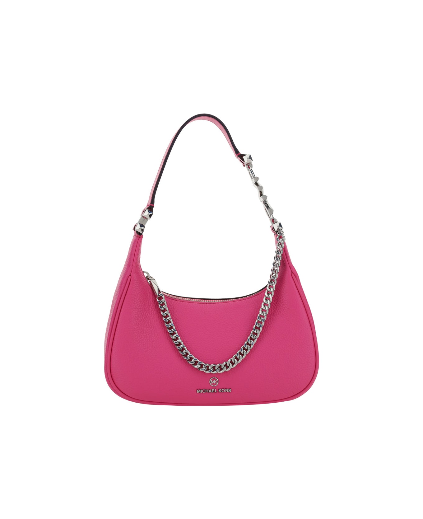 Piper shoulder bag by michael kors, hammered design, upper shoulder strap with chain detail and double gold plated chain strap, iconic brand monogram applied in contrasting embossing on the front, top zip closure, iconic brand monogram applied to the base of the shoulder strap, single internal compartment, internal welt pocket.