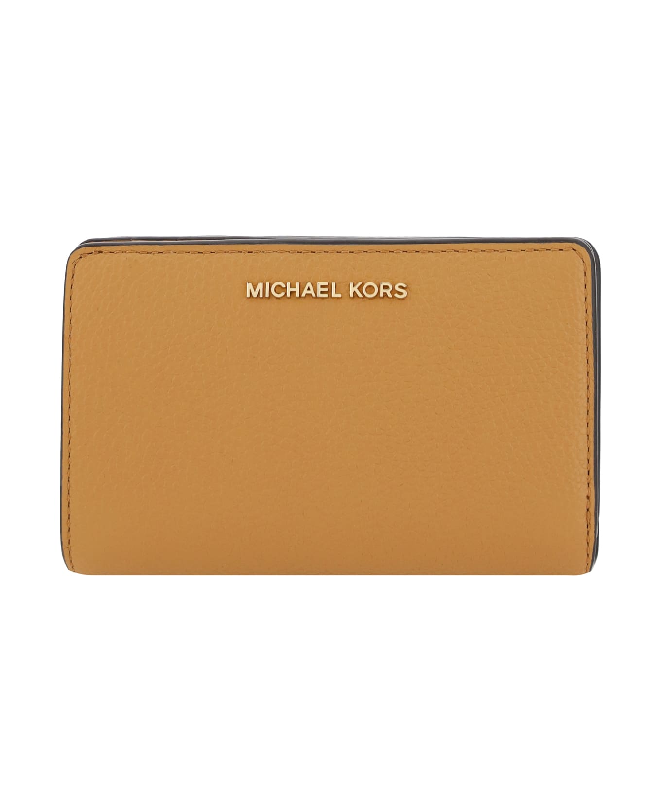 Calfskin wallet by michael kors, billfold model, grained leather design, snap-button closure, iconic brand monogram in contrasting color on front, billfold compartment, double interior card slots, coin compartment with zipper for closure.