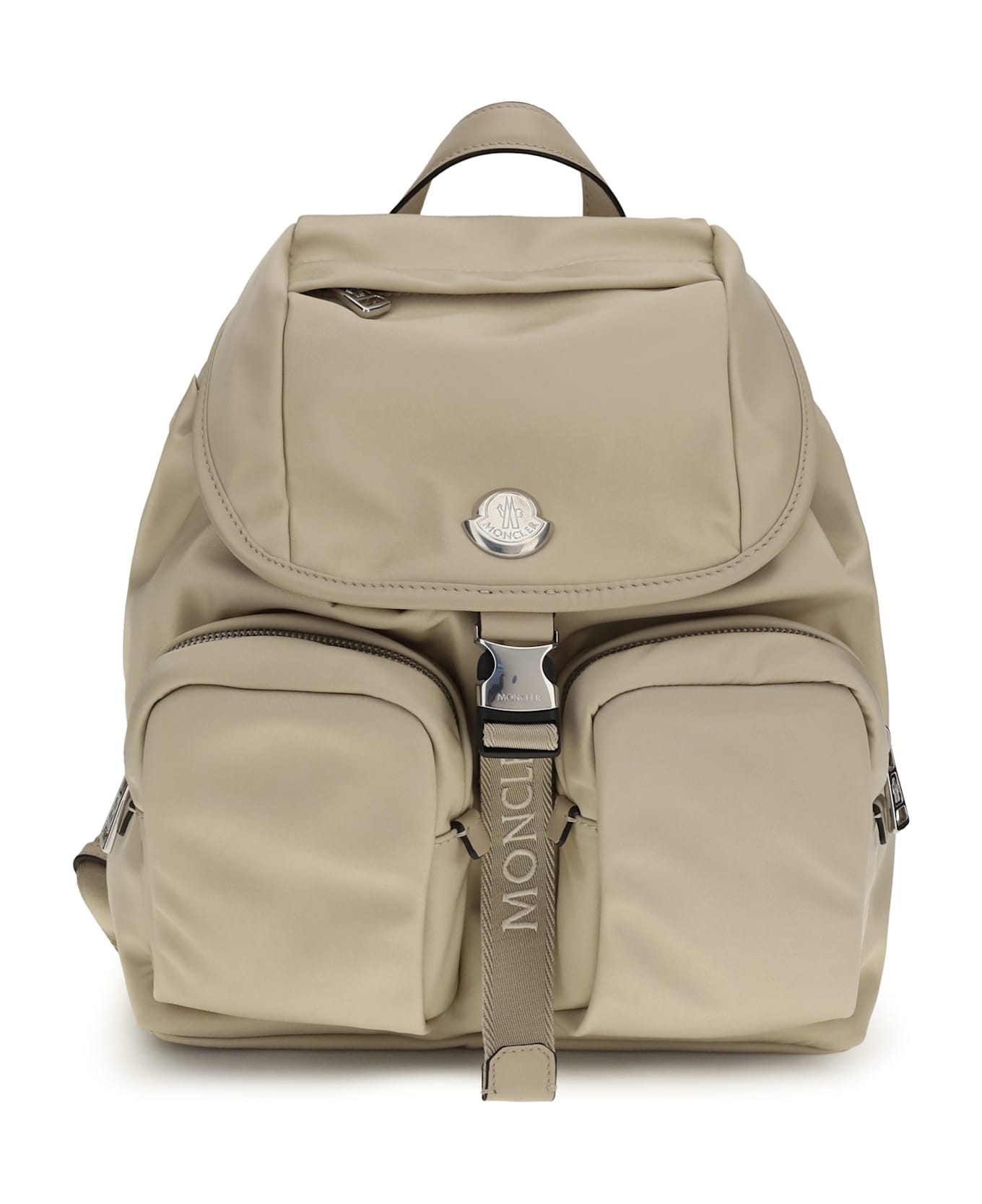 The new trick logo backpack by moncler is crafted from a durable nylon blend with a lining of the same material and leather trim. featuring a leather handle and adjustable straps, it has a buckle and drawstring closure, zippered pockets, and an internal pocket for multimedia devices, combining functionality and contemporary style.