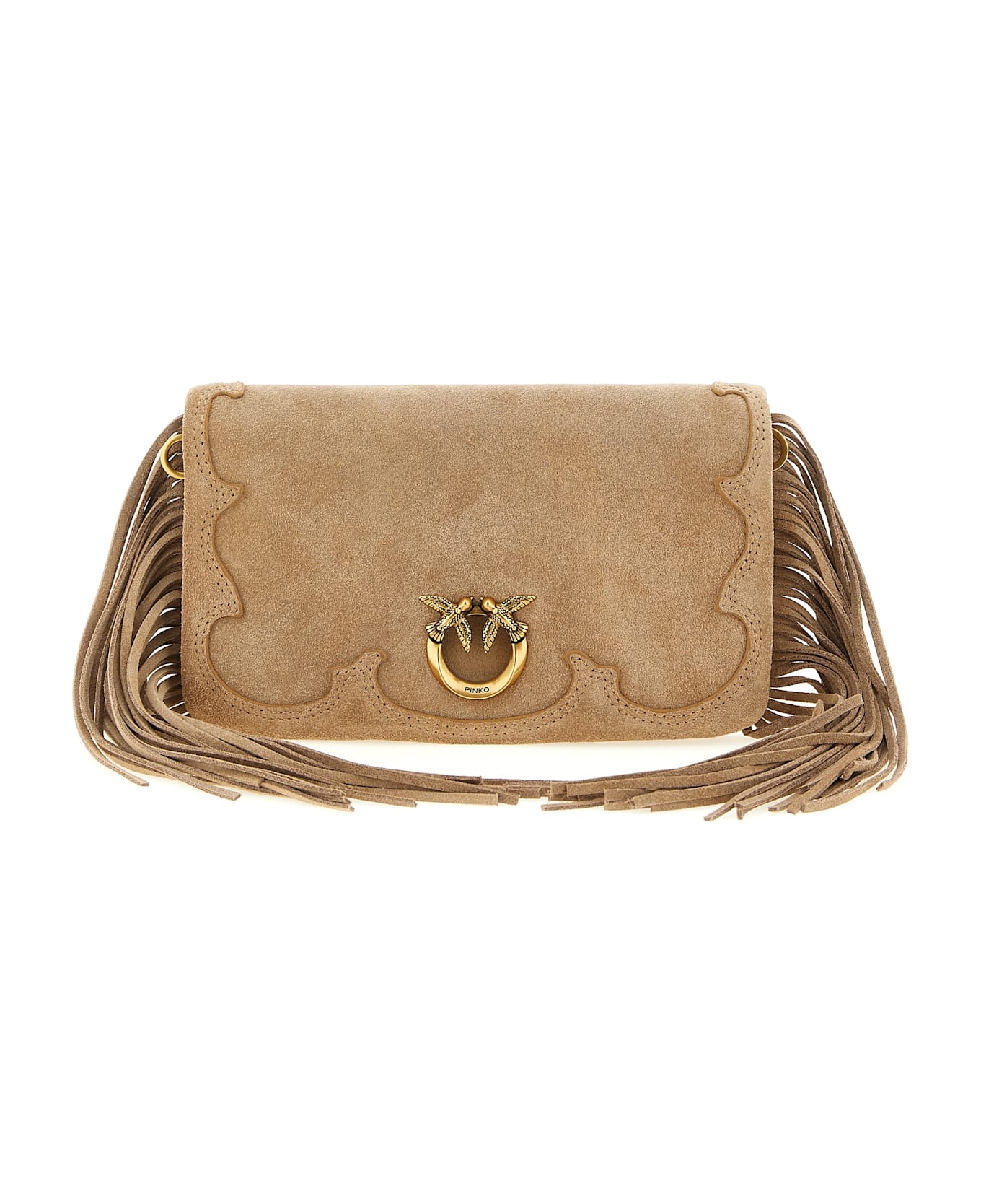 Love Click Soft Horizontal' mini suede clutch bag with tone-on-tone intarsia, flat design, rectangular shape with tone-on-tone fringes on the sides, magnetic flap closure with front metal 'Love Birds Diamond Cut' logo, back pocket, cotton drill lining, removable shoulder strap.