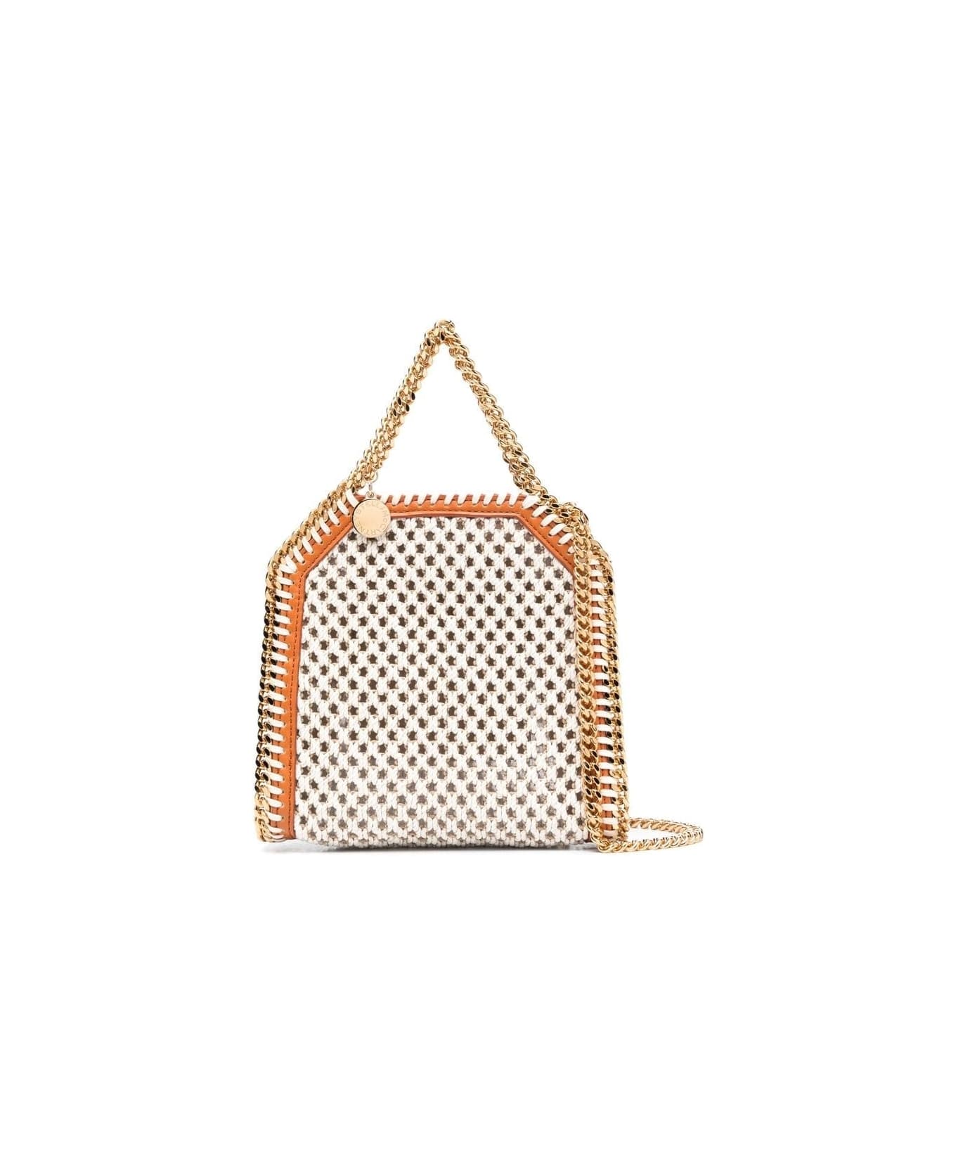 Ivory and beige Falabella micro tote bag by Stella McCartney crafted from recycled cotton-blend canvas with a mesh weave and featuring a nylon tulle layer, 3 gold-tone diamond-cut chains and contrasting Alter Mat (a vegan alternative to animal skin). The bag features a logo pendant, a single internal compartment, an internal pouch pocket and a press stud closure. Model can be worn in two ways: folded over the shoulder or as a hand bag. Product made without the use of leather, in accordance with the brand's cruelty-free ethics.